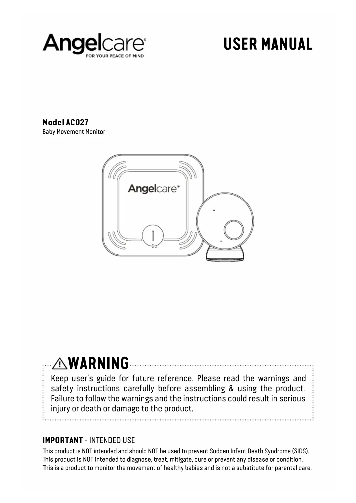 Keep user’s guide for future reference. Please read the warnings and safety instructions carefully before assembling & using the product. Failure to follow the warnings and the instructions could result in serious injury or death or damage to the product. WARNING Model AC027 Baby Movement Monitor USER MANUAL
