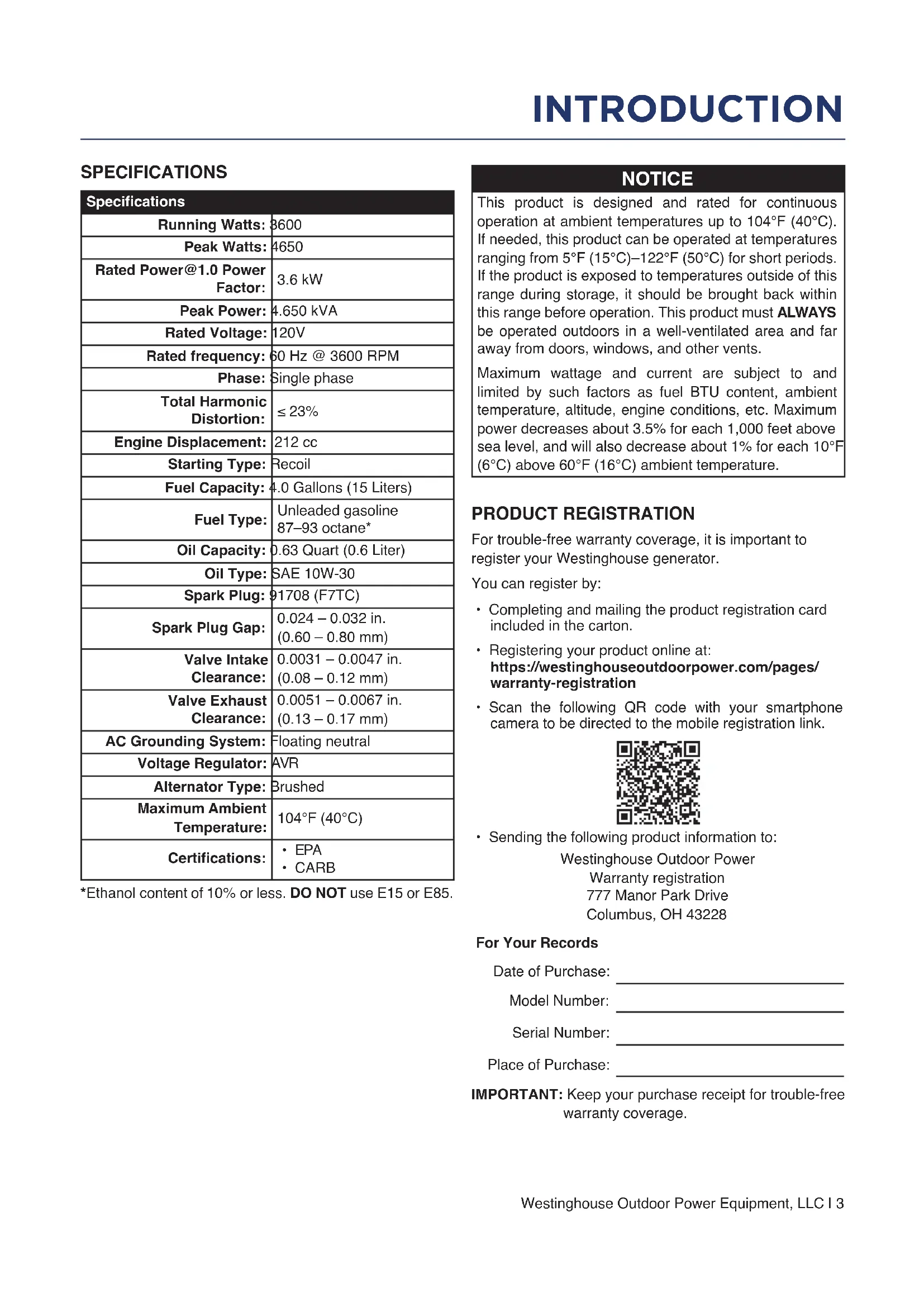 - CARB *Ethanol content of 10% or less. DO NOT use E15 or E85. NOTICE This product is designed and rated for continuous operation at ambient temperatures up to 104°F (40°C). If needed, this product can be operated at temperatures ranging from 5°F (15°C)–122°F (50°C) for short periods. If the product is exposed to temperatures outside of this range during storage, it should be brought back within this range before operation. This product must ALWAYS be operated outdoors in a well-ventilated area and far away from doors, windows, and other vents. Maximum wattage and current are subject to and limited by such factors as fuel BTU content, ambient temperature, altitude, engine conditions, etc. Maximum power decreases about 3.5% for each 1,000 feet above sea level, and will also decrease about 1% for each 10°F (6°C) above 60°F (16°C) ambient temperature. PRODUCT REGISTRATION For trouble-free warranty coverage, it is important to register your Westinghouse generator. You can register by: