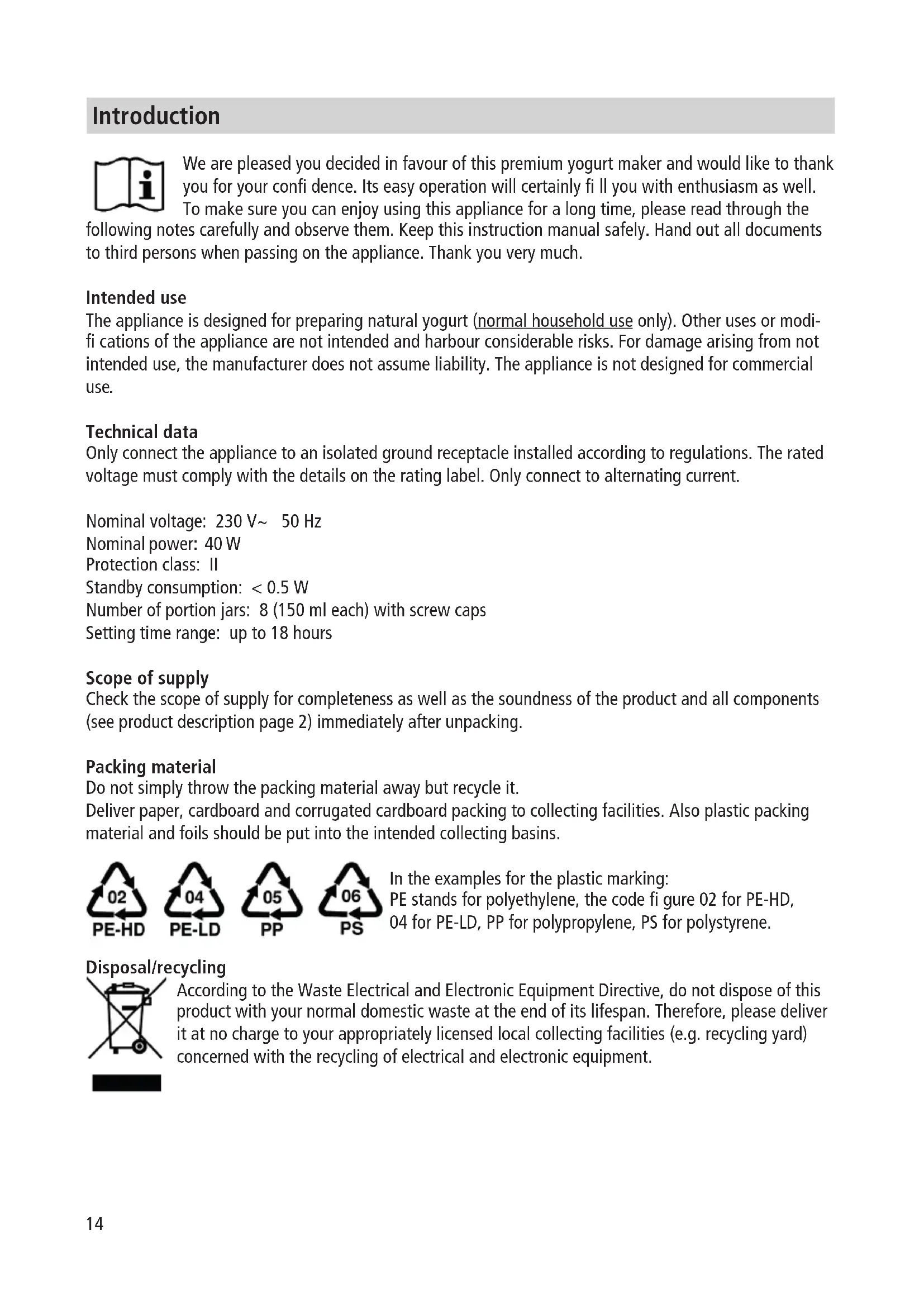 - Place the finished yogurt into the refrigerator for at least 4 hours in order to finally stop the ripening process. Only then the yogurt should be refined with ingredients, processed or consumed. NOTE: Before filling the jars clean them thoroughly and rinse with hot water. NOTE: Each button pressing is acknowledged by a signal tone. NOTE: Following to that you can use your home made yogurt for starting a new culture. Take the last portion jar (150 ml) to make a new mixture. In case you take natural yogurt as starter, you can repeat this procedure for 4 - 6 times. Using ferment as a starter, this procedure can be repeated up to 20 times. After that a new starter culture should be used.19 Cleaning and maintenance ATTENTION: Hazard of injury and burns! Before cleaning, always unplug the appliance and let all parts cool down! Never immerse the appliance and the plug in water or clean them under running water!