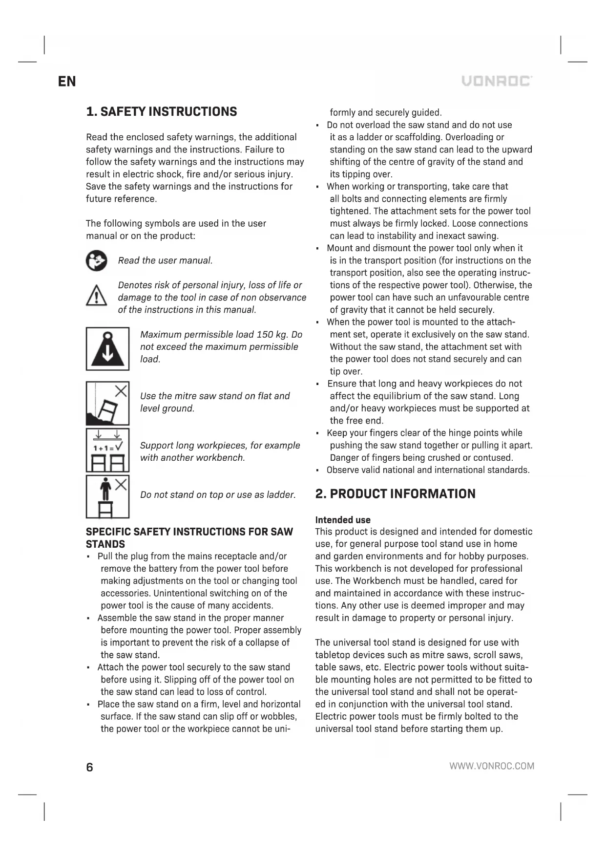 Read the enclosed safety warnings, the additional safety warnings and the instructions. Failure to follow the safety warnings and the instructions may result in electric shock, fire and/or serious injury. Save the safety warnings and the instructions for future reference. The following symbols are used in the user manual or on the product: Read the user manual. Denotes risk of personal injury, loss of life or damage to the tool in case of non observance of the instructions in this manual. Maximum permissible load 150 kg. Do not exceed the maximum permissible load. Use the mitre saw stand on flat and level ground. Support long workpieces, for example with another workbench. Do not stand on top or use as ladder.