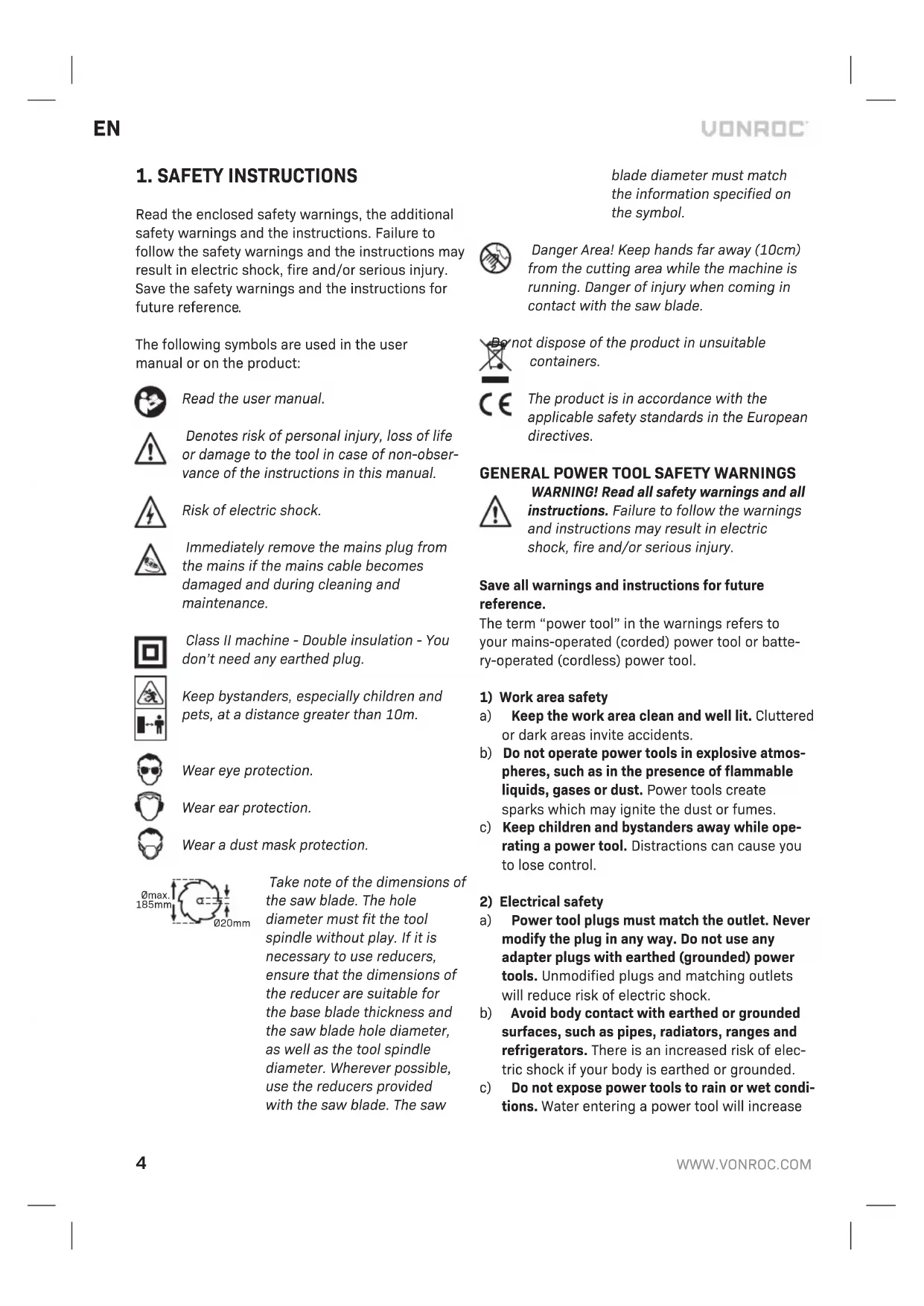 The following symbols are used in the user manual or on the product: Read the user manual. Denotes risk of personal injury, loss of life or damage to the tool in case of non-obser- vance of the instructions in this manual. Risk of electric shock. Immediately remove the mains plug from the mains if the mains cable becomes damaged and during cleaning and maintenance. Class II machine - Double insulation - You don’t need any earthed plug. Keep bystanders, especially children and pets, at a distance greater than 10m. Wear eye protection. Wear ear protection. Wear a dust mask protection. Ø20mm Ømax. 185mm Take note of the dimensions of the saw blade. The hole diameter must fit the tool spindle without play. If it is necessary to use reducers, ensure that the dimensions of the reducer are suitable for the base blade thickness and the saw blade hole diameter, as well as the tool spindle diameter. Wherever possible, use the reducers provided with the saw blade. The saw blade diameter must match the information specified on the symbol. Danger Area! Keep hands far away (10cm) from the cutting area while the machine is running. Danger of injury when coming in contact with the saw blade. Do not dispose of the product in unsuitable containers. The product is in accordance with the applicable safety standards in the European directives.