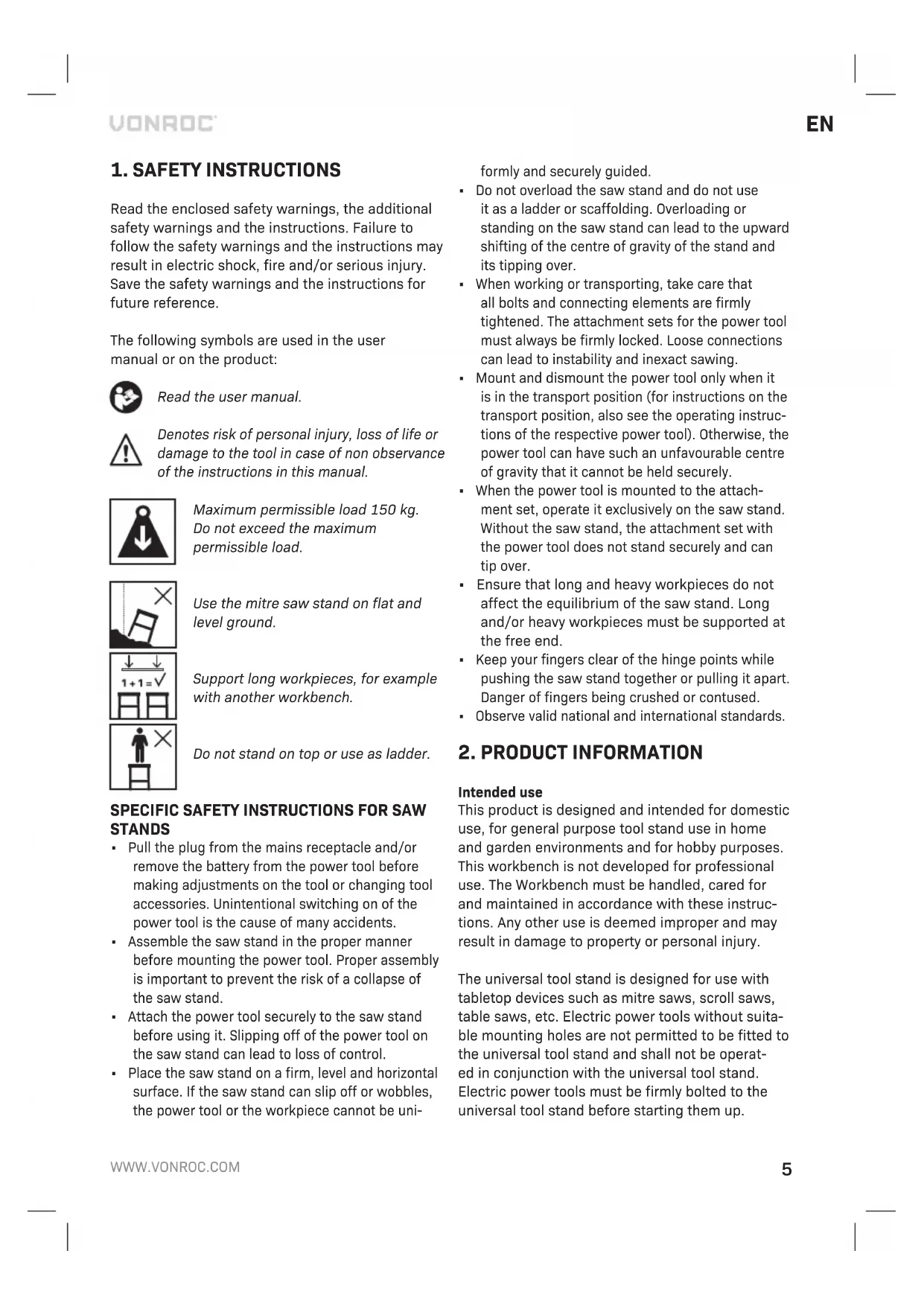 Read the enclosed safety warnings, the additional safety warnings and the instructions. Failure to follow the safety warnings and the instructions may result in electric shock, fire and/or serious injury. Save the safety warnings and the instructions for future reference. The following symbols are used in the user manual or on the product: Read the user manual. Denotes risk of personal injury, loss of life or damage to the tool in case of non observance of the instructions in this manual. Maximum permissible load 150 kg. Do not exceed the maximum permissible load. Use the mitre saw stand on flat and level ground. Support long workpieces, for example with another workbench. Do not stand on top or use as ladder.
