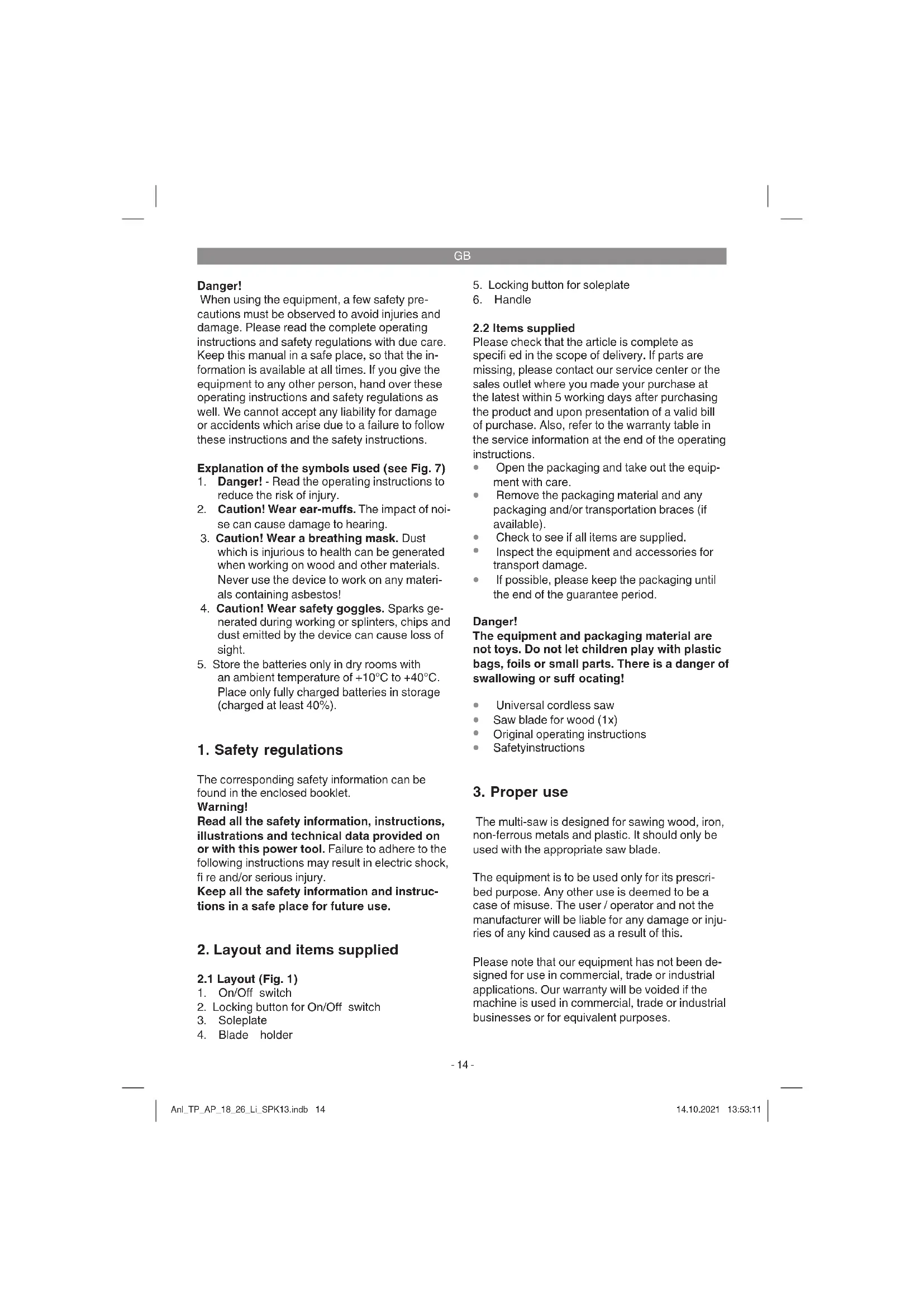 The multi-saw is designed for sawing wood, iron, non-ferrous metals and plastic. It should only be used with the appropriate saw blade. The equipment is to be used only for its prescri- bed purpose. Any other use is deemed to be a case of misuse. The user / operator and not the manufacturer will be liable for any damage or inju- ries of any kind caused as a result of this. Please note that our equipment has not been de- signed for use in commercial, trade or industrial applications. Our warranty will be voided if the machine is used in commercial, trade or industrial businesses or for equivalent purposes. Anl_TP_AP_18_26_Li_SPK13.indb 14Anl_TP_AP_18_26_Li_SPK13.indb 14 14.10.2021 13:53:1114.10.2021 13:53:11GB