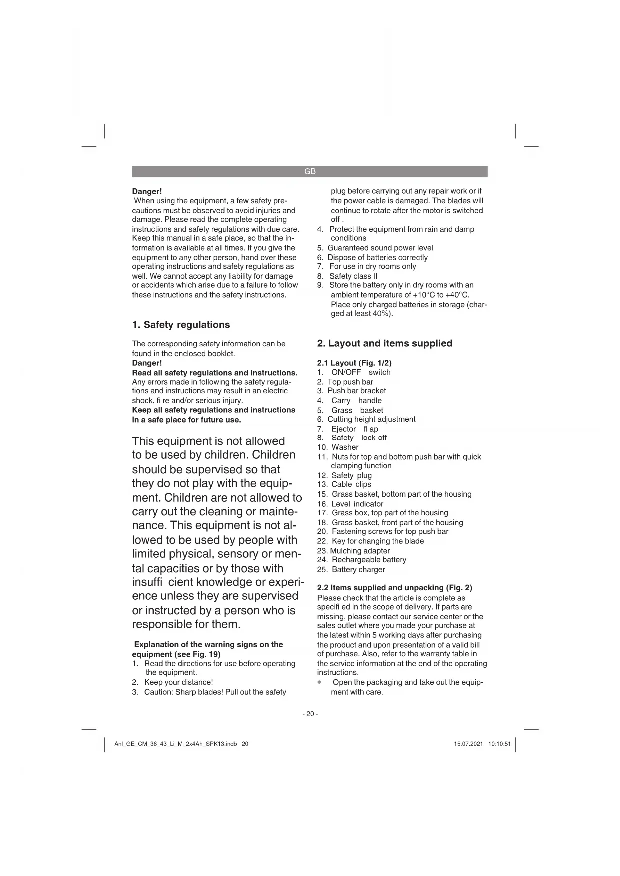 together as shown in Fig. 7. Then plug the top part of the housing (Item 17) onto the previously assembled parts (Fig. 8).Before you fi t the grass basket you must ensure that the motor is swit- ched off and the blade is not rotating. Lift the ejector fl ap (Item 7) with one hand. With the other hand, hold the grass basket by the handle and hook it in from above (Fig. 9). Filling level indicator of the grass collector The grass box is equipped with a fi lling level in- dicator (Fig. 2/Item 16). which is opened by the airfl ow that the lawn mower generates during ope- ration. If the fl ap closes during mowing, the grass collecting device is full and must be emptied. To ensure the proper functioning of the fi lling level indicator, the holes under the fl ap must always be kept clean and passable. Adjusting the cutting height Caution! Adjust the cutting height only when the machine has been switched off and the safety plug has been pulled out. Before you begin to mow, check to ensure that the blade is not blunt and that none of the fasteners are damaged. To prevent any imbalance, replace blunt and/or damaged blades. To carry out this check, fi rst switch off the motor and pull out the safety plug. Anl_GE_CM_36_43_Li_M_2x4Ah_SPK13.indb 22Anl_GE_CM_36_43_Li_M_2x4Ah_SPK13.indb 22 15.07.2021 10:10:5115.07.2021 10:10:51GB