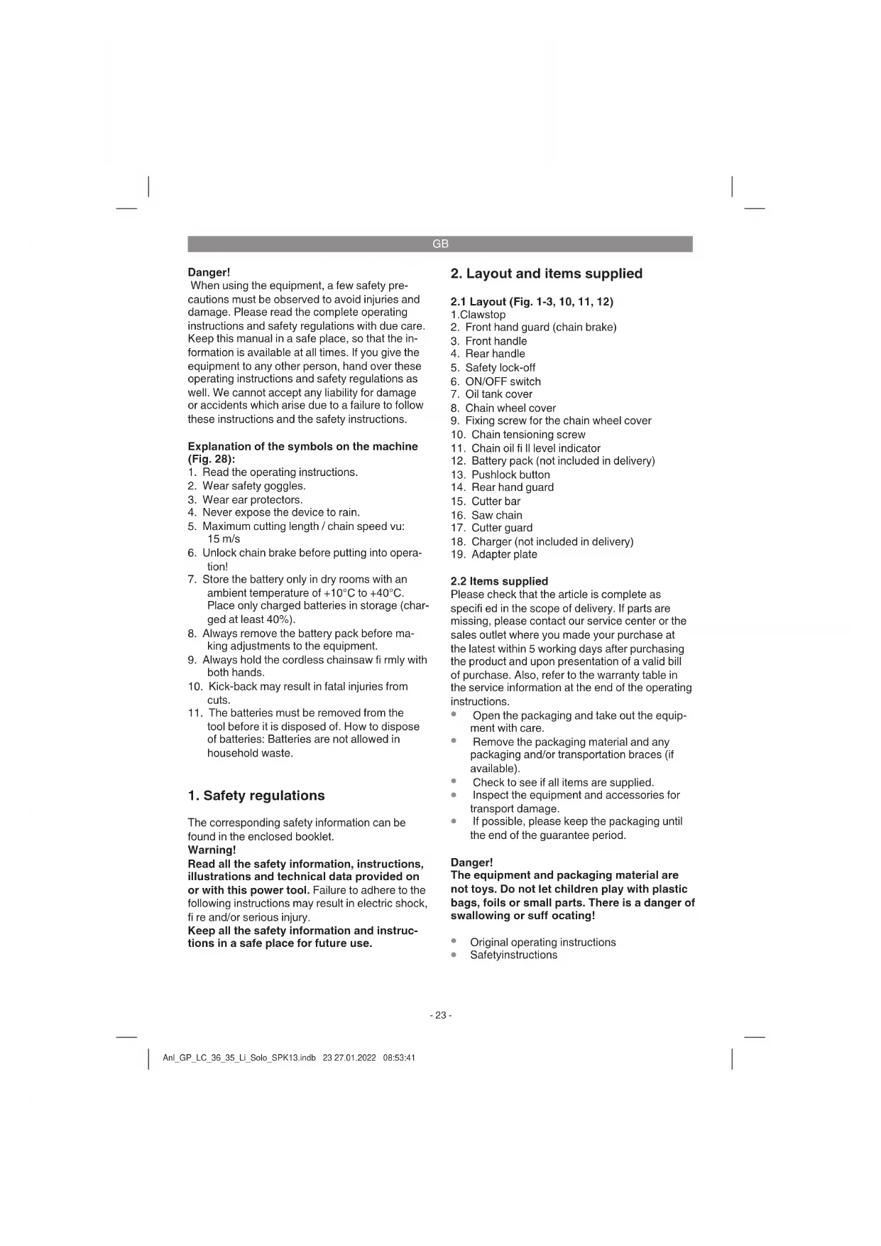 Motor brake The motor brakes the saw chain as soon as the ON/OFF switch (Fig. 1/Item 6) is released or the power supply is interrupted. This signifi cantly reduces the risk of injury that would otherwise be present if the chain continued to run after being switched off or disconnected. Chain brake The chain brake is a safety mechanism which is triggered via the front hand guard (Fig. 1/Item 2). If kickback causes the chainsaw to suddenly jerk back then the chain brake trips and stops the saw chain in less than 0.1 seconds. You must check the operation of the chain brake on a regular ba- sis. To do this, fold the hand guard (Fig. 1/Item 2) forward and briefl y switch the chainsaw on. The saw chain must not start up. Pull back the front hand guard (Fig. 1/Item 2) until it engages to release the chain brake. Anl_GP_LC_36_35_Li_Solo_SPK13.indb 26 27.01.2022 08:53:42GB