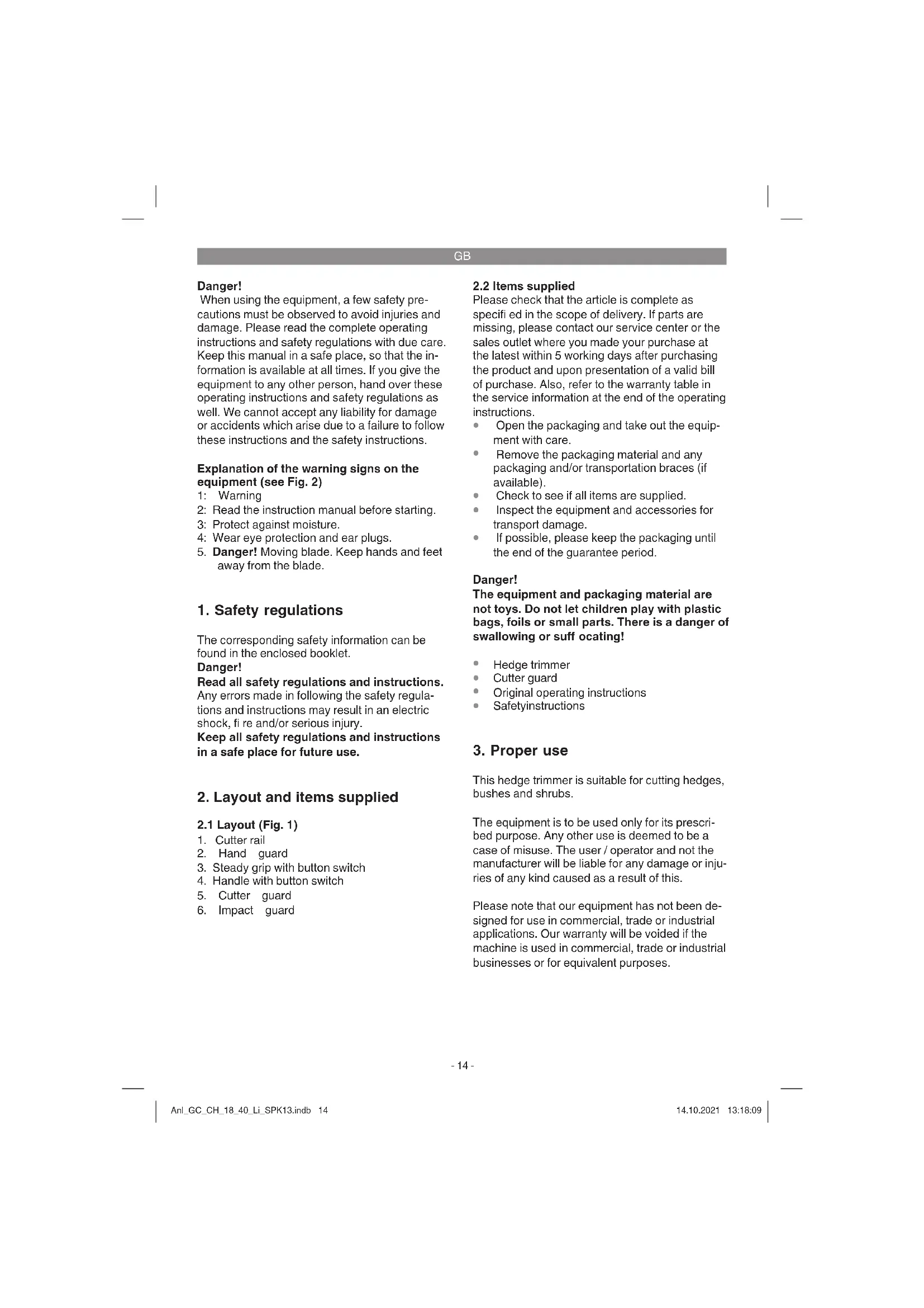This hedge trimmer is suitable for cutting hedges, bushes and shrubs. The equipment is to be used only for its prescri- bed purpose. Any other use is deemed to be a case of misuse. The user / operator and not the manufacturer will be liable for any damage or inju- ries of any kind caused as a result of this. Please note that our equipment has not been de- signed for use in commercial, trade or industrial applications. Our warranty will be voided if the machine is used in commercial, trade or industrial businesses or for equivalent purposes. Anl_GC_CH_18_40_Li_SPK13.indb 14Anl_GC_CH_18_40_Li_SPK13.indb 14 14.10.2021 13:18:0914.10.2021 13:18:09GB