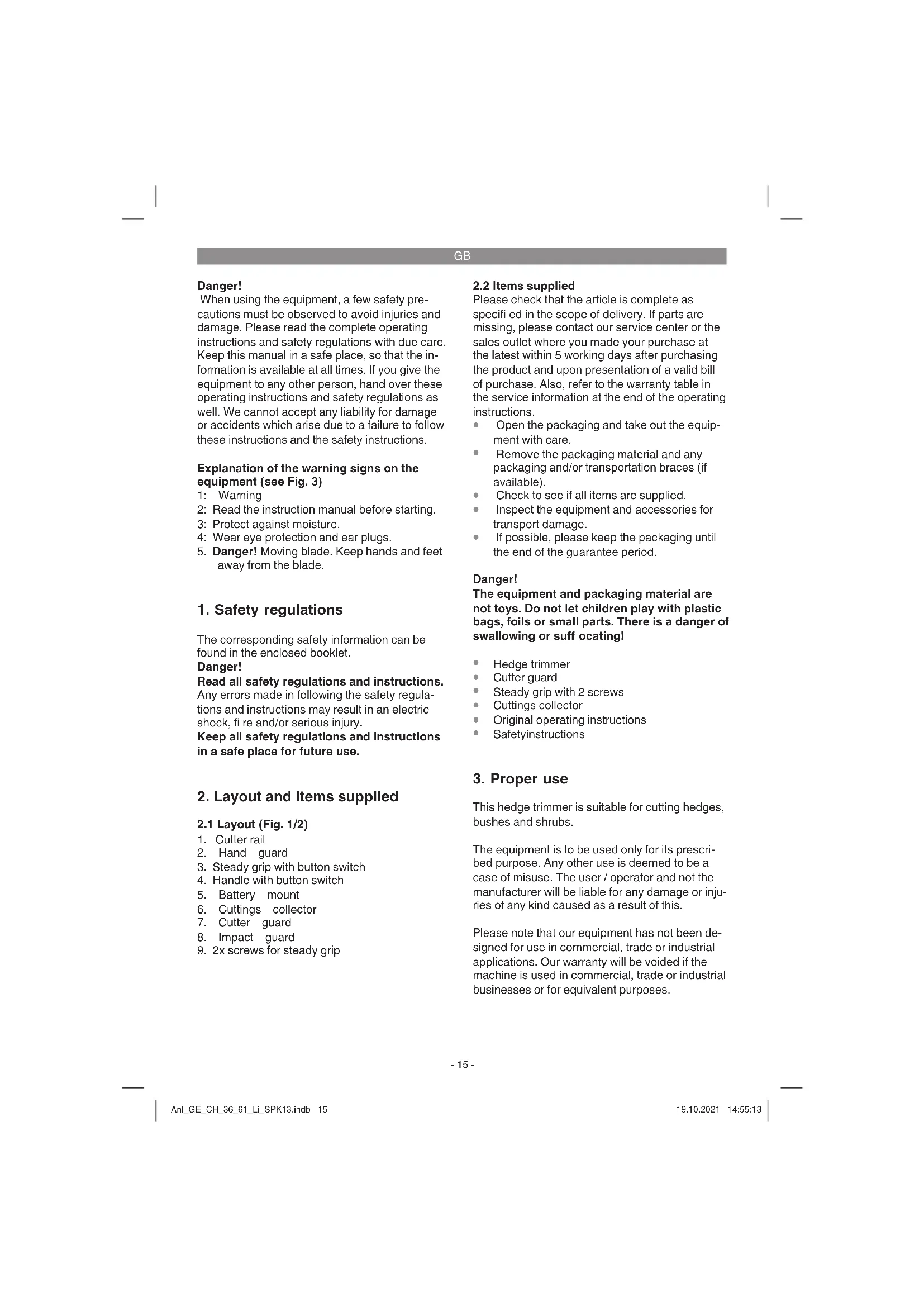 This hedge trimmer is suitable for cutting hedges, bushes and shrubs. The equipment is to be used only for its prescri- bed purpose. Any other use is deemed to be a case of misuse. The user / operator and not the manufacturer will be liable for any damage or inju- ries of any kind caused as a result of this. Please note that our equipment has not been de- signed for use in commercial, trade or industrial applications. Our warranty will be voided if the machine is used in commercial, trade or industrial businesses or for equivalent purposes. Anl_GE_CH_36_61_Li_SPK13.indb 15Anl_GE_CH_36_61_Li_SPK13.indb 15 19.10.2021 14:55:1319.10.2021 14:55:13GB