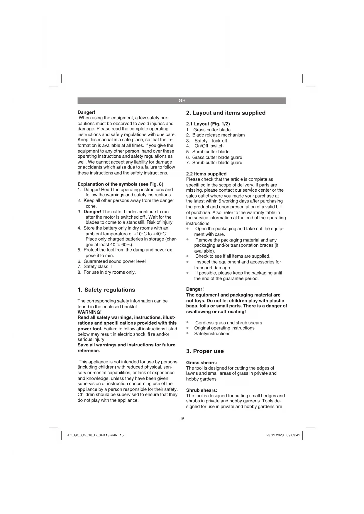 Grass shears: The tool is designed for cutting the edges of lawns and small areas of grass in private and hobby gardens. Shrub shears: The tool is designed for cutting small hedges and shrubs in private and hobby gardens. Tools de- signed for use in private and hobby gardens are Anl_GC_CG_18_Li_SPK13.indb 15Anl_GC_CG_18_Li_SPK13.indb 15 23.11.2023 09:03:4123.11.2023 09:03:41GB