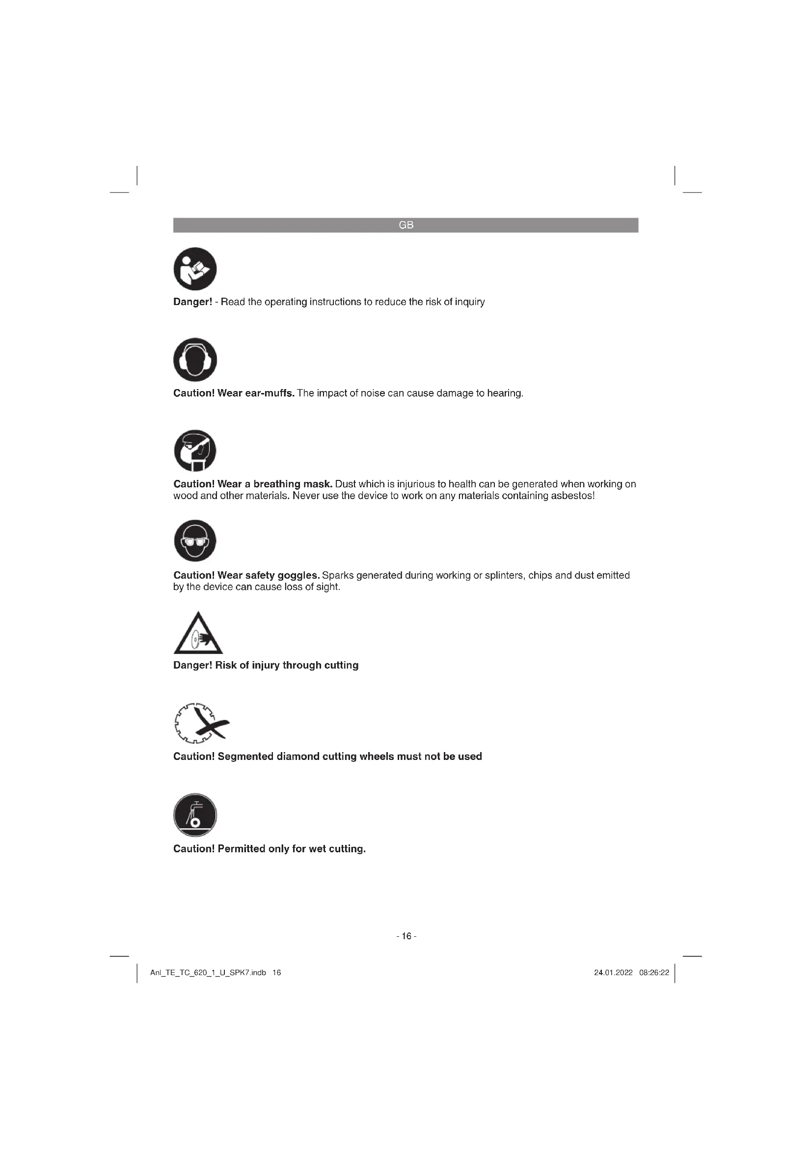 Danger! - Read the operating instructions to reduce the risk of inquiry Caution! Wear ear-muff s. The impact of noise can cause damage to hearing. Caution! Wear safety goggles. Sparks generated during working or splinters, chips and dust emitted by the device can cause loss of sight. Caution! Wear a breathing mask. Dust which is injurious to health can be generated when working on wood and other materials. Never use the device to work on any materials containing asbestos! Danger! Risk of injury through cutting Caution! Segmented diamond cutting wheels must not be used Caution! Permitted only for wet cutting. Anl_TE_TC_620_1_U_SPK7.indb 16Anl_TE_TC_620_1_U_SPK7.indb 16 24.01.2022 08:26:2224.01.2022 08:26:22GB