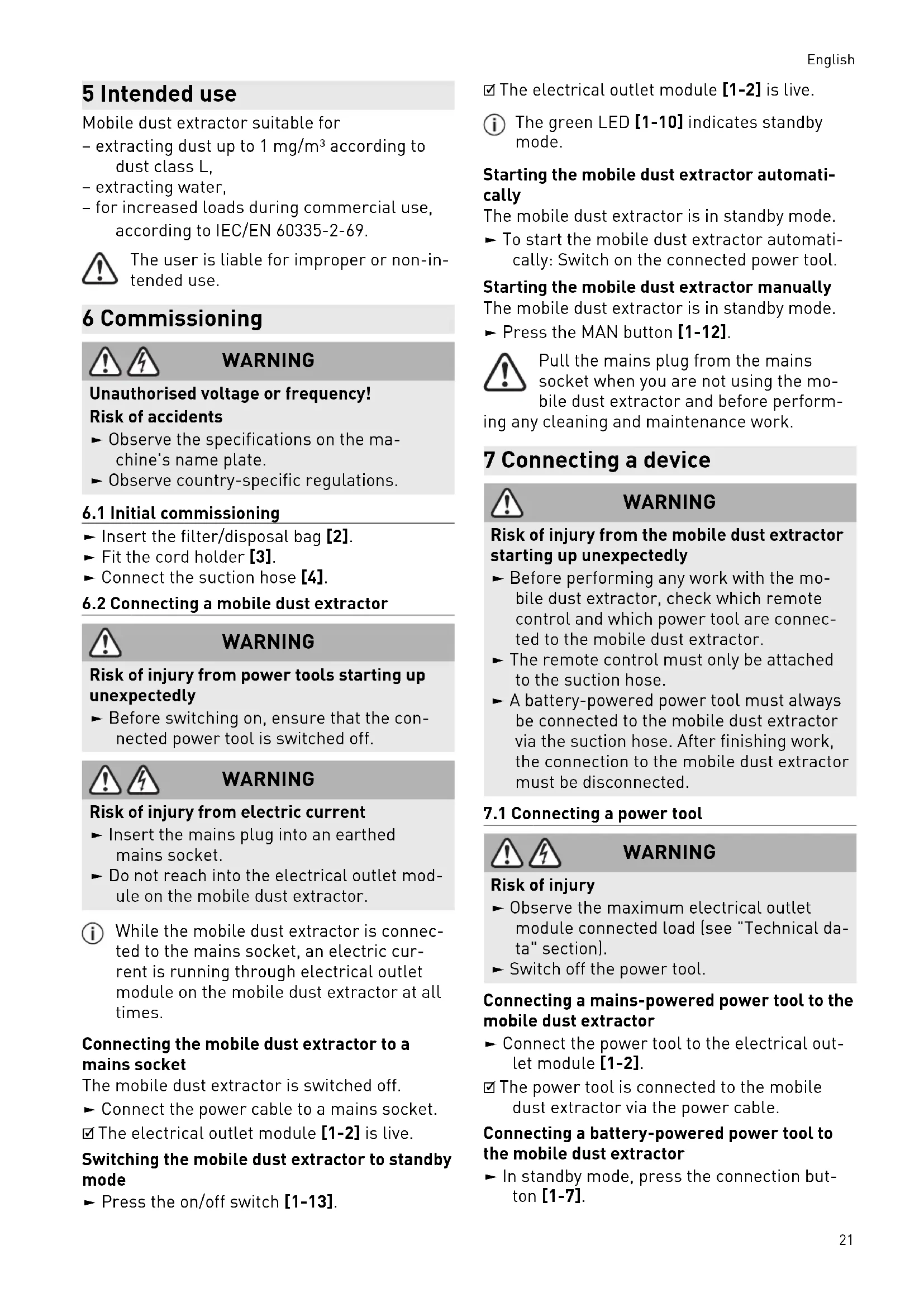 WARNING Risk of injury ► Observe the maximum electrical outlet module connected load (see "Technical da ta" section). ► Switch off the power tool. Connecting a mains-powered power tool to the mobile dust extractor ► Connect the power tool to the electrical out let module[1-2]. ☑ The power tool is connected to the mobile dust extractor via the power cable. Connecting a battery-powered power tool to the mobile dust extractor ► In standby mode, press the connection but ton[1-7]. English 21The connection display[1-6] flashes slowly. For a period of 60seconds, the mobile dust extractor is ready for connection. ► Turn on the battery-powered power tool. The mobile dust extractor starts up and the battery-powered power tool is connected until the mobile dust extractor is manually switched off or the mains plug is disconnec ted. The cordless tool must then be connec ted again. Connecting a new battery-powered power tool overwrites the previous connection.