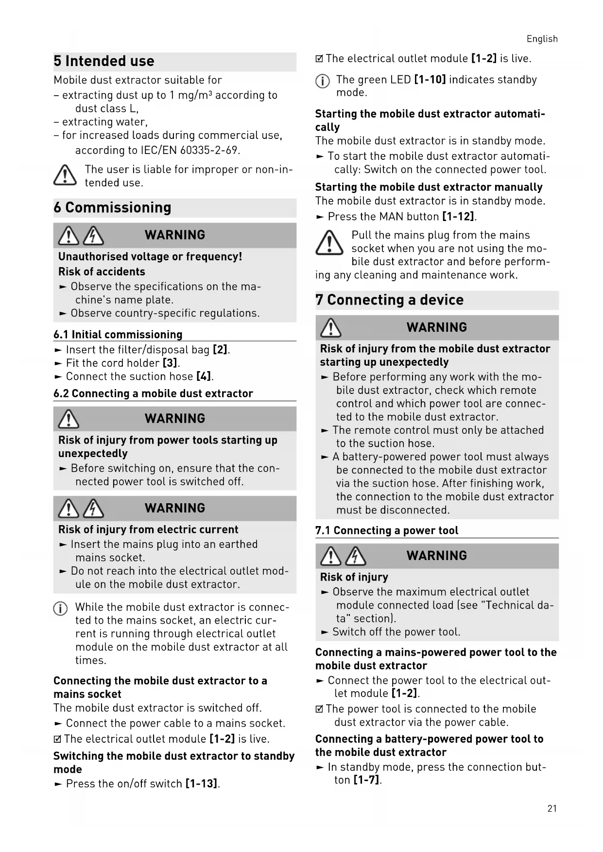 WARNING Risk of injury ► Observe the maximum electrical outlet module connected load (see "Technical da ta" section). ► Switch off the power tool. Connecting a mains-powered power tool to the mobile dust extractor ► Connect the power tool to the electrical out let module[1-2]. ☑ The power tool is connected to the mobile dust extractor via the power cable. Connecting a battery-powered power tool to the mobile dust extractor ► In standby mode, press the connection but ton[1-7]. English 21The connection display[1-6] flashes slowly. For a period of 60seconds, the mobile dust extractor is ready for connection. ► Turn on the battery-powered power tool. The mobile dust extractor starts up and the battery-powered power tool is connected until the mobile dust extractor is manually switched off or the mains plug is disconnec ted. The cordless tool must then be connec ted again. Connecting a new battery-powered power tool overwrites the previous connection.