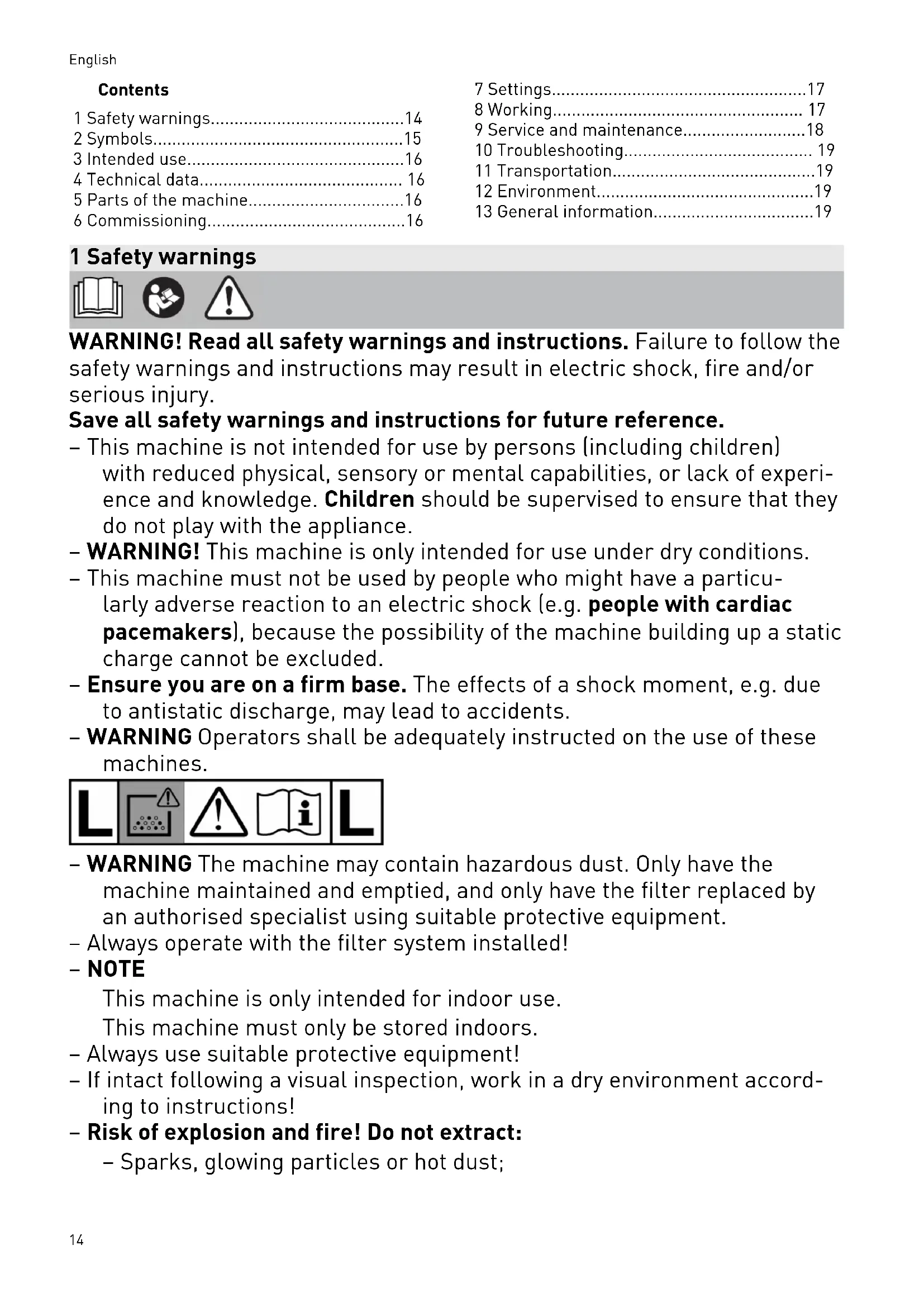 CAUTION Hazardous dust Damage to the respiratory passage ► Always use a filter bag! English 17Two cleaning nozzles are stored in the in side of the dust extractor [6-1]. Observe the following information: – The dust extractor is a stationary system and not suitable for pulling at the cable and hose. Use handle [1-4]. – A static charge may build up if no antistatic suction hose is used. The user may receive an electric shock. When extracting dust that exceeds the limit value, only extract from one dust source (power or compressed-air tool). Observe the following when extracting dust generated by operating power tools: Ensure there is adequate ventilation! Observe regional regulations! Limit values: Exhaust air max. 50% of the fresh air volume Equation: Room volume V