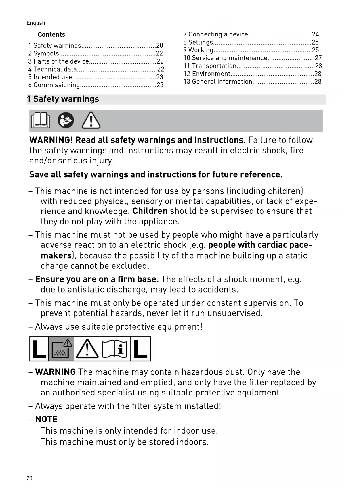 - 13 General information 1 Safety warnings WARNING! Read all safety warnings and instructions. Failure to follow the safety warnings and instructions may result in electric shock, fire and/or serious injury. Save all safety warnings and instructions for future reference. – This machine is not intended for use by persons (including children) with reduced physical, sensory or mental capabilities, or lack of expe rience and knowledge. Children should be supervised to ensure that they do not play with the appliance. – This machine must not be used by people who might have a particularly adverse reaction to an electric shock (e.g. people with cardiac pace makers), because the possibility of the machine building up a static charge cannot be excluded. – Ensure you are on a firm base. The effects of a shock moment, e.g. due to antistatic discharge, may lead to accidents. – This machine must only be operated under constant supervision. To prevent potential hazards, never let it run unsupervised. – Always use suitable protective equipment! – WARNING The machine may contain hazardous dust. Only have the machine maintained and emptied, and only have the filter replaced by an authorised specialist using suitable protective equipment. – Always operate with the filter system installed! – NOTE This machine is only intended for indoor use. This machine must only be stored indoors. English 20– WARNING Only use the socket outlet on the machine for purposes specified in the instructions. – WARNING If foam or liquid escapes from the machine, switch off immediately. – CAUTION Clean the water level limiting device regularly and examine it for signs of damage. – WARNING Operators shall be adequately instructed on the use of these machines. – WARNING: When extracting dust that exceeds the limit value or large volumes of oak or beechwood dust, only extract from one dust source (power or compressed-air tool). – Risk of explosion and fire! Do not extract: – Sparks, glowing particles or hot dust; – combustible or explosive materials (e.g. magnesium, aluminium, petrol, diluting agents); – aggressive materials (e.g. acid, alkaline solutions, solvents); – chemically reactive materials which lead to the generation of heat, acids/bases, gases, etc. (e.g. reactive two-component materials, aluminium and water). – Observe all national safety regulations as well as the material manu facturer's specifications! – The mains plug must always be disconnected from the socket before performing cleaning or maintenance tasks, when replacing consuma bles or when converting the machine. – If intact following a visual inspection, work in a dry environment according to instructions! – Check the plug, the electrical outlet module, the cable and the filter regularly in order to prevent a hazard. Damaged electrical components must be replaced by an authorised service workshop only. – Use only the original Festool suction hose. – Pay attention to the work environment and watch out for your own safety and the safety of others when transporting or working with the machine. In this way, you can for example prevent tripping hazards caused by the suction hose or mains cable. – Only carry the machine using the handle provided. – Do not lift or transport using a crane hook or lifting gear. English 21– Keep packaging film away from children. There is a risk of suffocation. 2 Symbols Warning of general danger Warning of electric shock Read the operating manual and safety warnings. Wear a dust mask. Tip or advice WARNING! The machine may contain hazardous dust! Dust classL (low risk) suitable for separation of dust with an exposure limit value greater than 1 mg/m p. 28