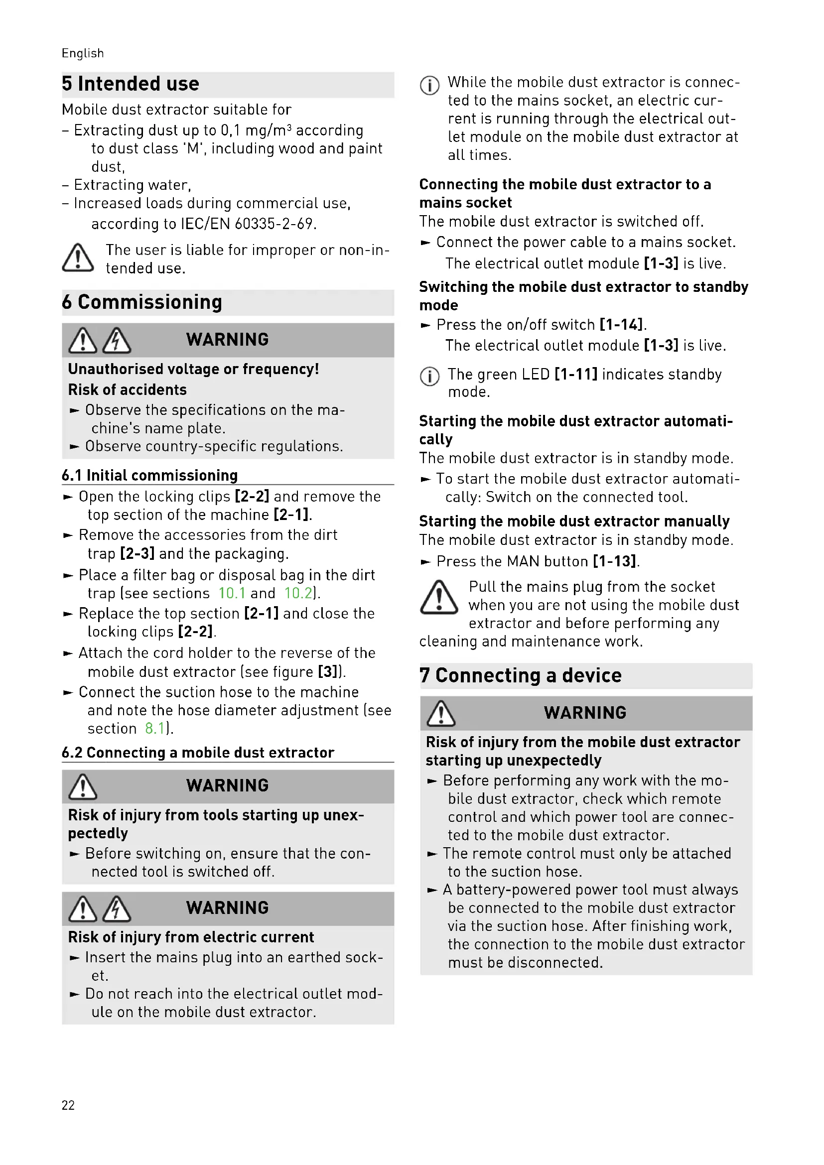 WARNING Risk of injury from electric current ► Insert the mains plug into an earthed sock et. ► Do not reach into the electrical outlet mod ule on the mobile dust extractor. While the mobile dust extractor is connec ted to the mains socket, an electric cur rent is running through the electrical out let module on the mobile dust extractor at all times. Connecting the mobile dust extractor to a mains socket The mobile dust extractor is switched off. ► Connect the power cable to a mains socket. The electrical outlet module[1-3] is live. Switching the mobile dust extractor to standby mode ► Press the on/off switch[1-14]. The electrical outlet module[1-3] is live. The green LED[1-11] indicates standby mode. Starting the mobile dust extractor automati cally The mobile dust extractor is in standby mode. ► To start the mobile dust extractor automati cally: Switch on the connected tool. Starting the mobile dust extractor manually The mobile dust extractor is in standby mode. ► Press the MAN button[1-13]. Pull the mains plug from the socket when you are not using the mobile dust extractor and before performing any cleaning and maintenance work. 7 Connecting a device