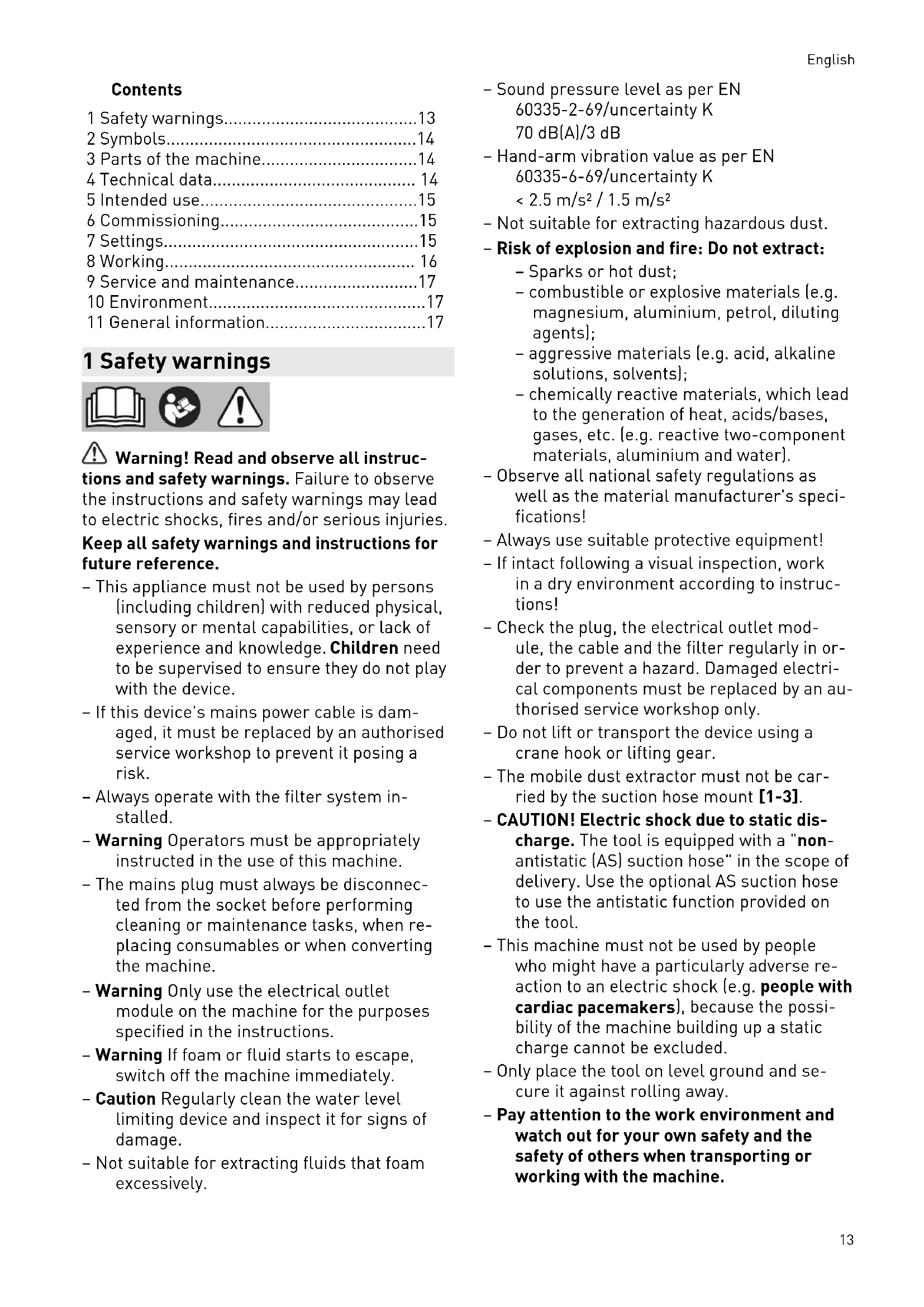- 11 General information 1 Safety warnings Warning! Read and observe all instruc tions and safety warnings. Failure to observe the instructions and safety warnings may lead to electric shocks, fires and/or serious injuries. Keep all safety warnings and instructions for future reference. – This appliance must not be used by persons (including children) with reduced physical, sensory or mental capabilities, or lack of experience and knowledge. Children need to be supervised to ensure they do not play with the device. – If this device's mains power cable is dam aged, it must be replaced by an authorised service workshop to prevent it posing a risk. – Always operate with the filter system in stalled. – Warning Operators must be appropriately instructed in the use of this machine. – The mains plug must always be disconnec ted from the socket before performing cleaning or maintenance tasks, when re placing consumables or when converting the machine. – Warning Only use the electrical outlet module on the machine for the purposes specified in the instructions. – Warning If foam or fluid starts to escape, switch off the machine immediately. – Caution Regularly clean the water level limiting device and inspect it for signs of damage. – Not suitable for extracting fluids that foam excessively. – Sound pressure level as per EN 60335-2-69/uncertainty K 70 dB(A)/3 dB – Hand-arm vibration value as per EN 60335-6-69/uncertainty K < 2.5 m/s² / 1.5 m/s² – Not suitable for extracting hazardous dust. – Risk of explosion and fire: Do not extract: – Sparks or hot dust; – combustible or explosive materials (e.g. magnesium, aluminium, petrol, diluting agents); – aggressive materials (e.g. acid, alkaline solutions, solvents); – chemically reactive materials, which lead to the generation of heat, acids/bases, gases, etc. (e.g. reactive two-component materials, aluminium and water). – Observe all national safety regulations as well as the material manufacturer's speci fications! – Always use suitable protective equipment! – If intact following a visual inspection, work in a dry environment according to instruc tions! – Check the plug, the electrical outlet mod ule, the cable and the filter regularly in or der to prevent a hazard. Damaged electri cal components must be replaced by an au thorised service workshop only. – Do not lift or transport the device using a crane hook or lifting gear. – The mobile dust extractor must not be car ried by the suction hose mount [1-3]. – CAUTION! Electric shock due to static dis charge. The tool is equipped with a "non- antistatic (AS) suction hose" in the scope of delivery. Use the optional AS suction hose to use the antistatic function provided on the tool. – This machine must not be used by people who might have a particularly adverse re action to an electric shock (e.g. people with cardiac pacemakers ), because the possi bility of the machine building up a static charge cannot be excluded. – Only place the tool on level ground and se cure it against rolling away. – Pay attention to the work environment and watch out for your own safety and the safety of others when transporting or working with the machine. English 13In this way, you can for example prevent tripping hazards caused by the suction hose or mains cable. – Keep packaging film away from children. There is a risk of suffocation. 2 Symbols Warning of general danger Warning of electric shock Read the operating instructions and safety instructions. Do not dispose of it with domestic waste. Pull out the mains plug Wear a dust mask. Do not climb on the unit UKCA marking: The United Kingdom Conformity Assessed symbol is a marking for products being placed on the market in the United Kingdom. It is a manufacturers indication that the product is in conformance with the rel evant regulations in the UK. 3 Parts of the machine [1-1] Electrical outlet module [1-2] Cable and accessory holder [1-3] Suction hose mount [1-4] Handle [1-5] Lock [1-6] Filter drawer [1-7] Locking clip [1-8] Exhaust opening [1-9] Dirt trap [1-10] On/off switch [1-11] MAN button [1-12] Suction power adjustment The specified illustrations appear at the begin ning of the Operating Instructions. 4 Technical data Mobile dust extractors Power consumption 350–1200 W Max. electrical outlet module connected load EU CH, DK p. 17