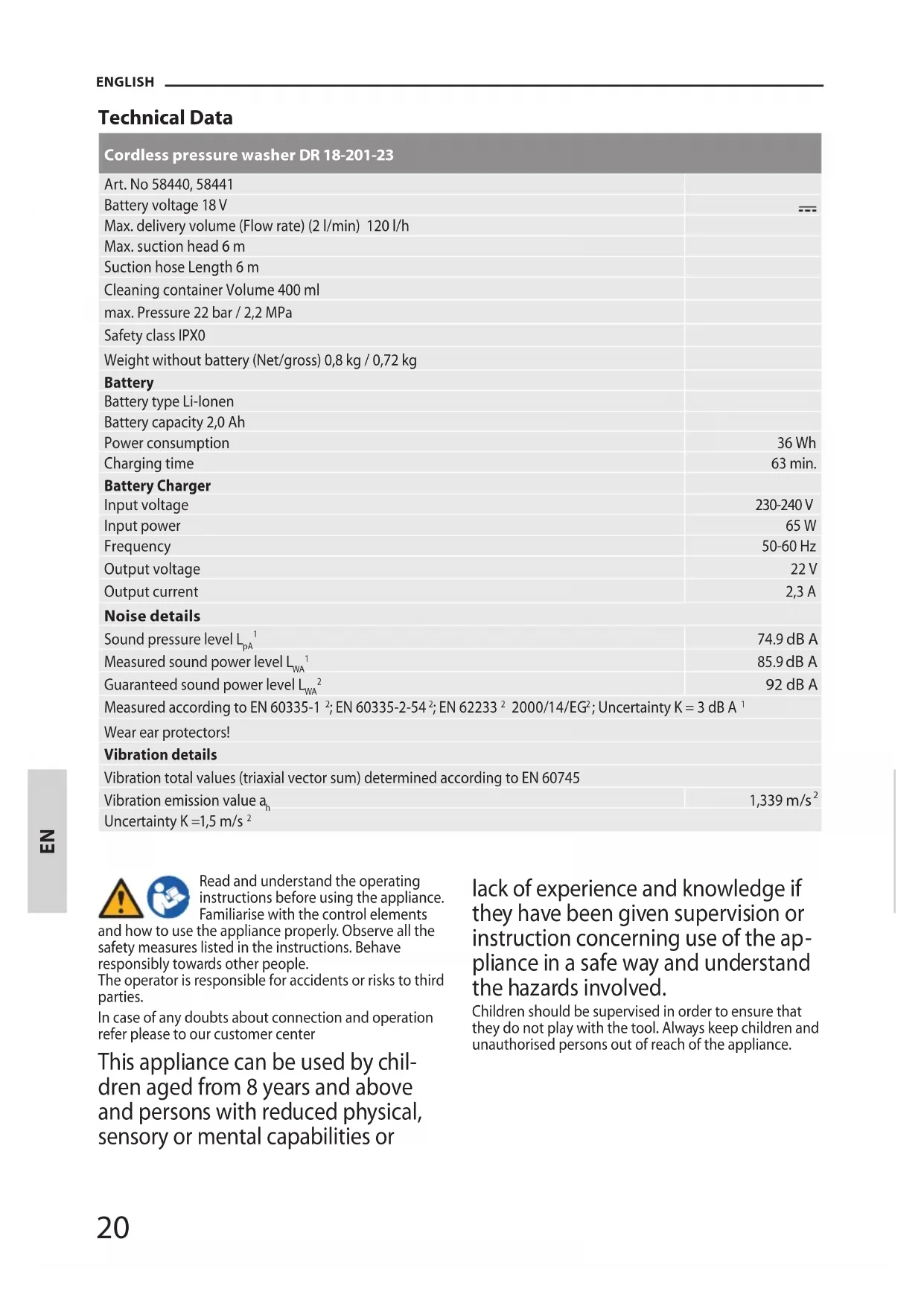pliance in a safe way andunderstand the hazards involved. Children should be supervised in order to ensure that they do not play with the tool. Always keep children and unauthorised persons out of reach of the appliance. EN21 ENGLISH Specied Conditions of Use The cordless pressure washer is suitable for cleaning and watering. Do not use this product in any other way as stated for normal use. Not observing general regulations in force and instructions from this manual does not make the manufacturer liable for damages. Residual Risk Even when the device is used properly and all safety regulations are complied with, there still may be some residual risks. Despite the observance of the operating instructions there still may be some hidden residual risks. Symbols Warning / Caution! Read the Operating Instructions Take the replaceable battery from the ap- pliance before any extension, cleaning and servicing works. Steam, Spray mist Wear protective clothing Wear goggles. Wear protective gloves. Use of crane Staying in the transportation medium prohibited Keep dry at all times. Never expose tool to rain. Keep the machine out of reach of children. Protect against cold Safety class III CE marking Any damaged or disposed electric or electro- nic devices must be delivered to appropriate collection centres. Battery Read the Operating Instructions Protect the battery against temperatures above 40°C. Protect the battery against heat and re. Protect the battery against water and moisture. Li-Ion Do not throw the batteries in household waste. Deliver the batteries to a collection centre of old batteries where they will be recycled in an environmentally friendly way. Battery Charger Warning / Caution! Read the Operating Instructions Charger to be used in closed spaces only. Battery is empty Battery charged Polarity Safety class II CE marking Any damaged or disposed electric or electronic devices must be delivered to appropriate collection centres. This side up EN22 ENGLISH Safety instructions for cordless pressure washers Do not point the tool towards yourself or anyone nearby. Wear safety goggles and suitable protective clothing to protect against splashing back water and dirt. When working with the equipment, persons within reach must wear protective clothing. Keep children and bystanders away while operating a power tool. Do not use the device near ammable liquids or gases. Risk of re and explosion in case of short circuit. Do not spray ammable liquids. There is a risk of ex
