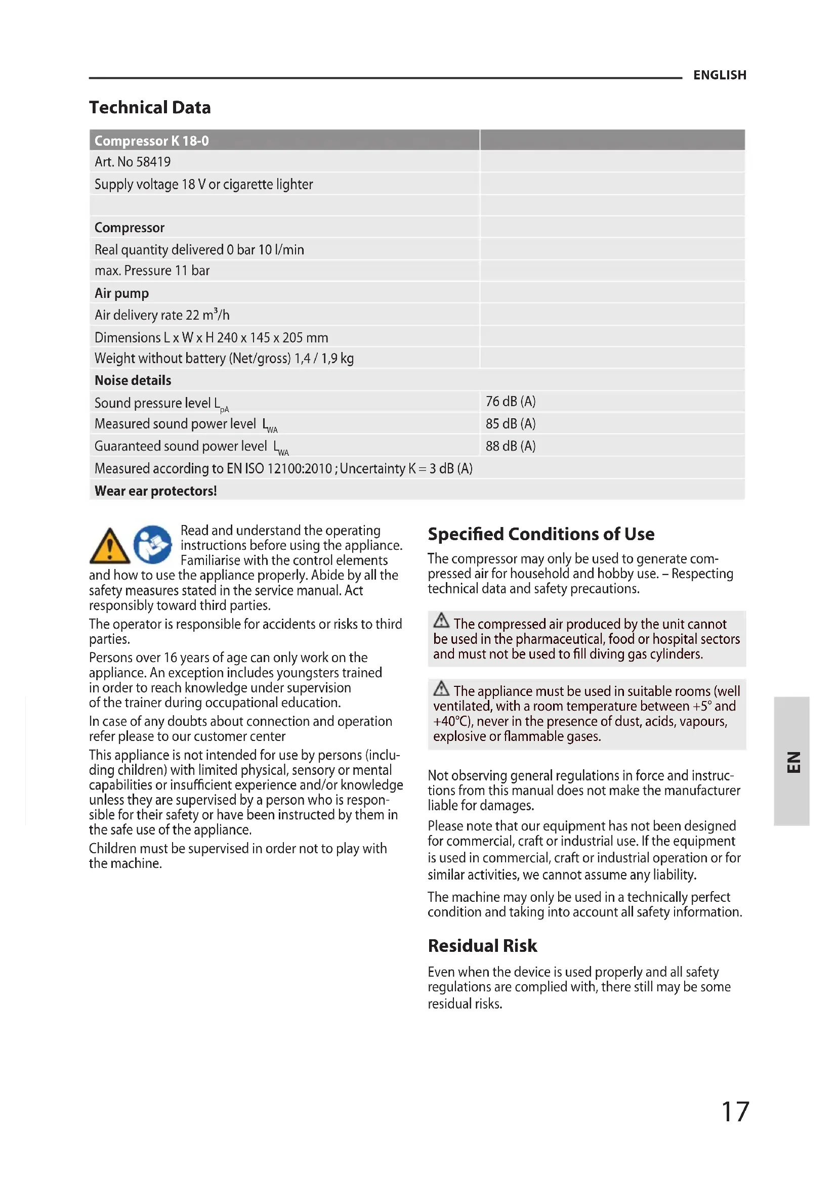 ding children) with limited physical, sensory or mental capabilities or insucien t experience and/or knowledge unless they are supervised by a person who is respon- sible for their safety or have been instructed by them in the safe use of the appliance. Children must be supervised in order not to play with the machine. Specied Conditions of Use The compressor may only be used to generate com- pressed air for household and hobby use. – Respecting technical data and safety precautions. The compressed air produced by the unit cannot be used in the pharmaceutical, food or hospital sectors and must not be used to ll diving gas cylinders. The appliance must be used in suitable rooms (well ventilated, with a room temperature between +5° and +40°C), never in the presence of dust, acids, vapours, explosive or ammable gases. Not observing general regulations in force and instruc- tions from this manual does not make the manufacturer liable f or damages. Please note that our equipment has not been designed for commercial, craft or industrial use. If the equipment is used in commercial, craft or industrial operation or for similar activities, we cannot assume any liability. The machine may only be used in a technically perfect condition and taking into account all safety information. Residual Risk Even when the device is used properly and all safety regulations are complied with, there still may be some residual risks. ENGLISH18