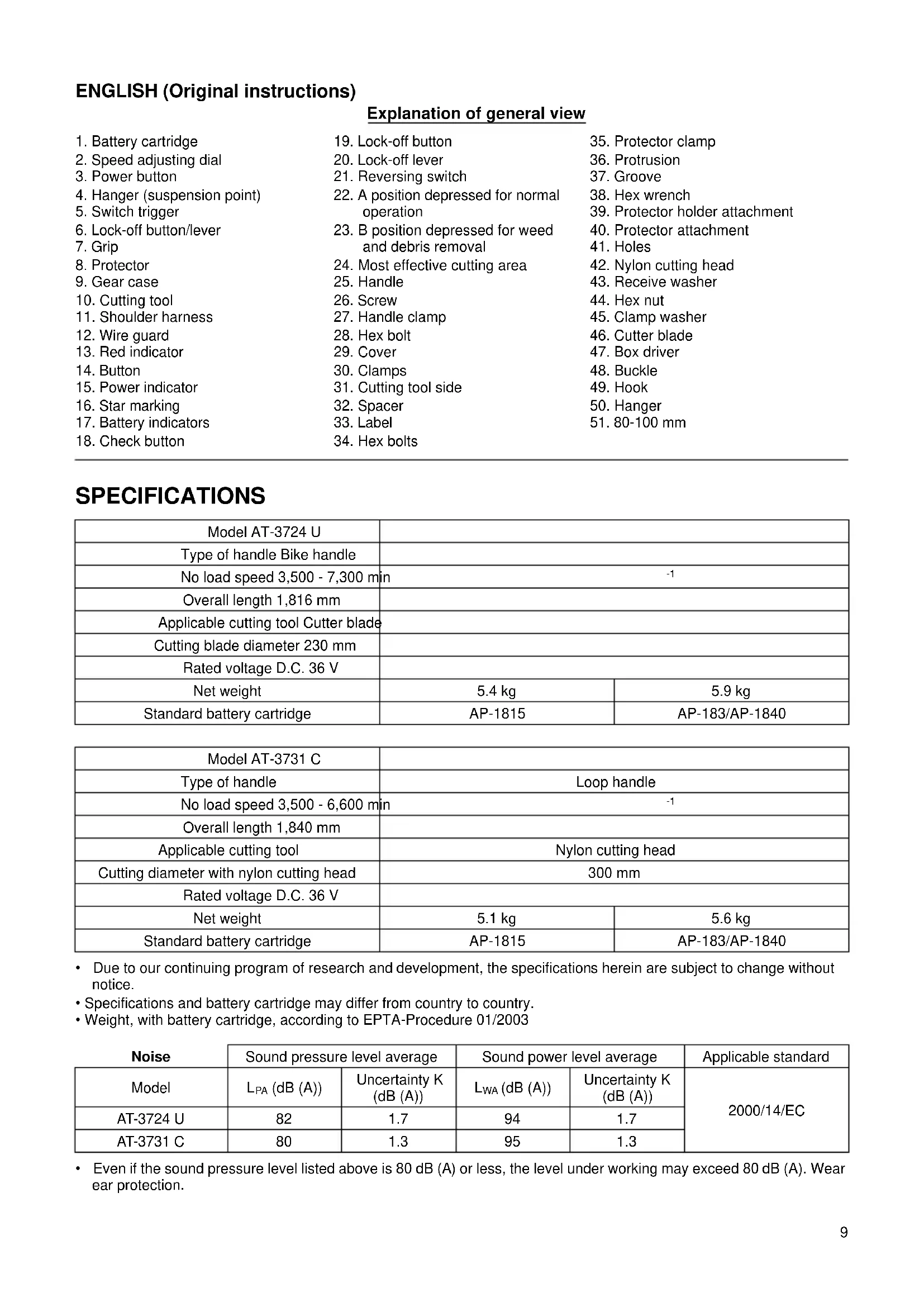 Rainer Bergfeld Managing Director For model AT-3731 C Symbols END020-3 The following show the symbols used for the equipment. Be sure that you understand their meaning before use. .......................Take particular care and attention. ............Read instruction manual. ......................Danger; be aware of thrown objects. ......................The distance between the tool and bystanders must be at least 15 m. ...............Keep bystanders away. ..............Keep distance at least 15 m. Vibration Left hand Right hand Applicable standard Model a