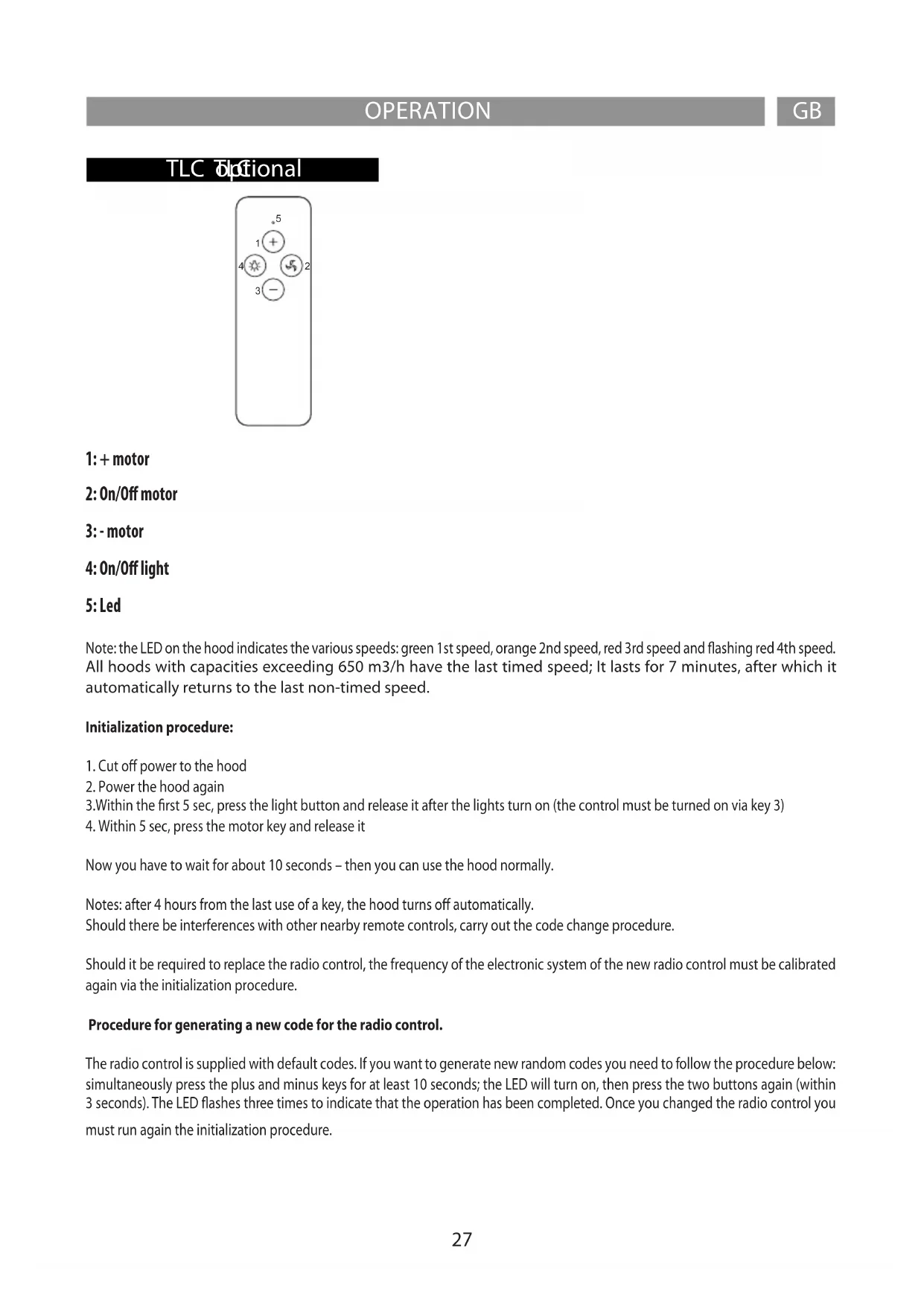 TLC OPERATION 1: + motor 2: On/O motor 3: - motor 4: On/O light 5: Led Note: the LED on the hood indicates the various speeds: green 1st speed, orange 2nd speed, red 3rd speed and ashing red 4th speed. All hoods with capacities exceeding 650 m3/h have the last timed speed; It lasts for 7 minutes, after which it automatically returns to the last non-timed speed. Initialization procedure:
