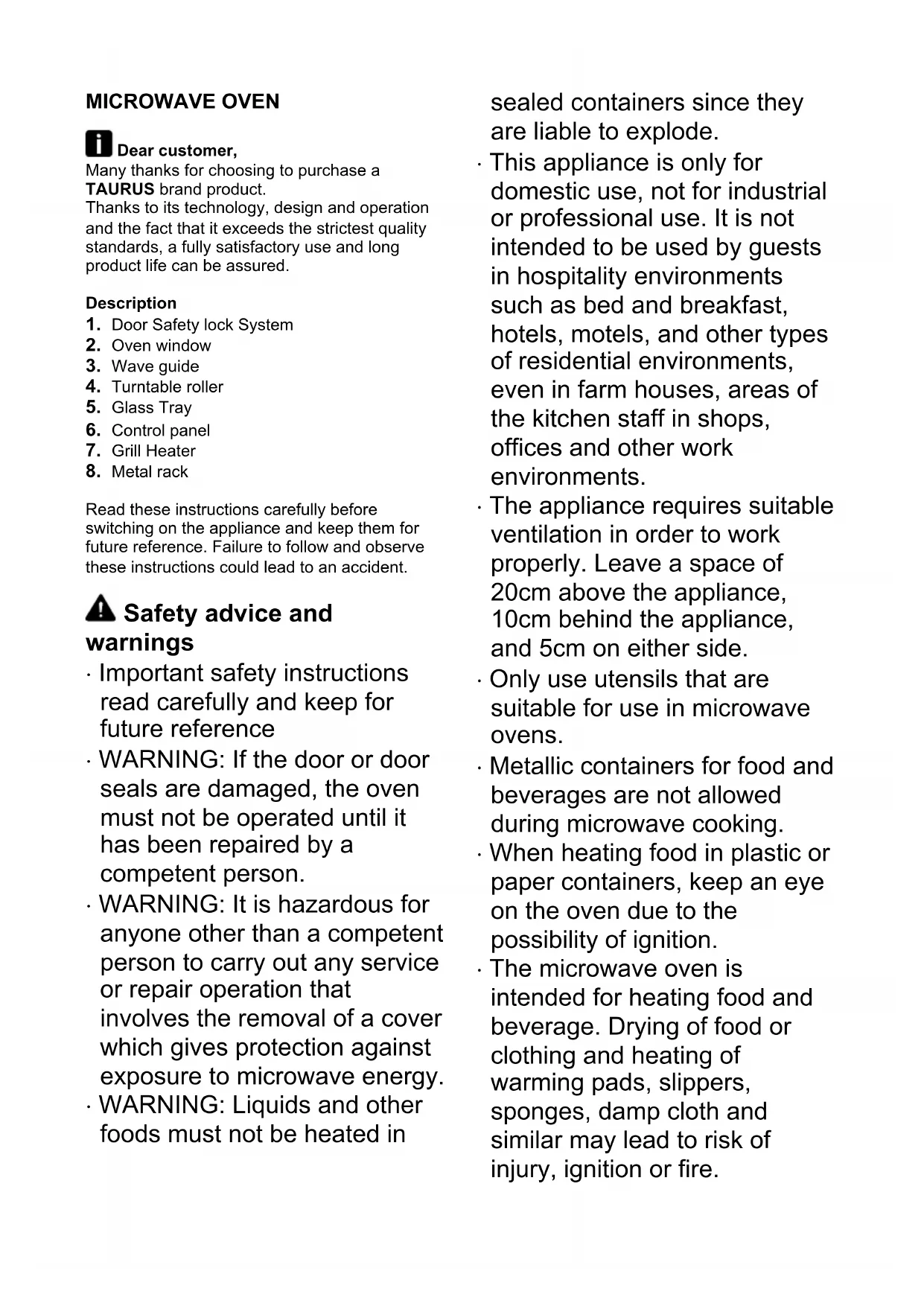 PRODUCT: The materials of which the packaging of this appliance consists are included in a collection, classification and recycling system. Should you wish to dispose of them, use the appropriate public recycling bins for each type of material. The product does not contain concentrations of substances that could be considered harmful to the environment. - This symbol means that in case you wish to dispose of the product once its working life has ended; take it to an authorised waste agent for the selective collection of Waste from Electric and Electronic Equipment (WEEE). - This symbol means that it is important to read the operating instructions. This appliance complies with Directive 2014/35/EU on Low Voltage, Directive 2014/30/EU on Electromagnetic Compatibility, Directive 2011/65/EU on the restrictions of the use of certain hazardous substances in electrical and electronic equipment and Directive 2009/125/EC on the ecodesign requirements for energy-related products.FOUR MICRO-ONDE Cher client, Nous vous remercions d’avoir acheté un produit TAURUS. Sa technologie, son design et sa fonctionnalité, s’ajoutant au fait qu’il répond amplement aux normes de qualité les plus strictes, vous permettront d’en obtenir une satisfaction longue et durable DESCRIPTION