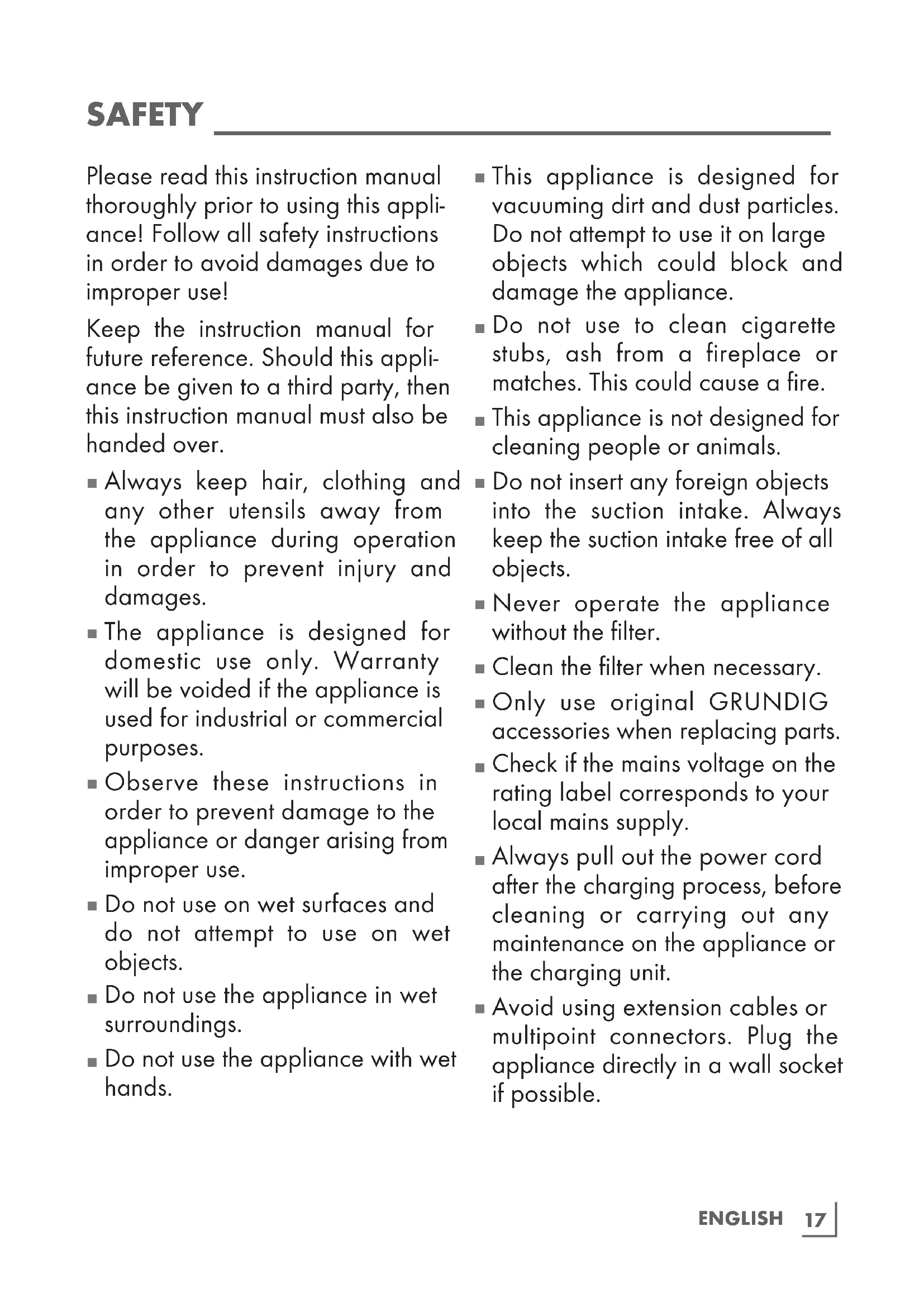 The supply terminals are not to be short-circuited.20 ENGLISH OVERVIEW _______________________________ Dear Customer, Congratulations on the purchase of your new GRUNDIG 2-in1 cordless vacuum cleaner VCP 3929 L. Please read the following user notes carefully so that you can enjoy your quality Grundig product for many years to come. A responsible approach! GRUNDIG focuses on contractually agreed social working conditions with fair wages for both internal employees and suppliers, as well as on the efficient use of raw materials with continual waste reduction of several tonnes of plastic each year – and availability of at least 5 years for all accessories. For a future worth living. Grundig. Controls parts See image on page 3.