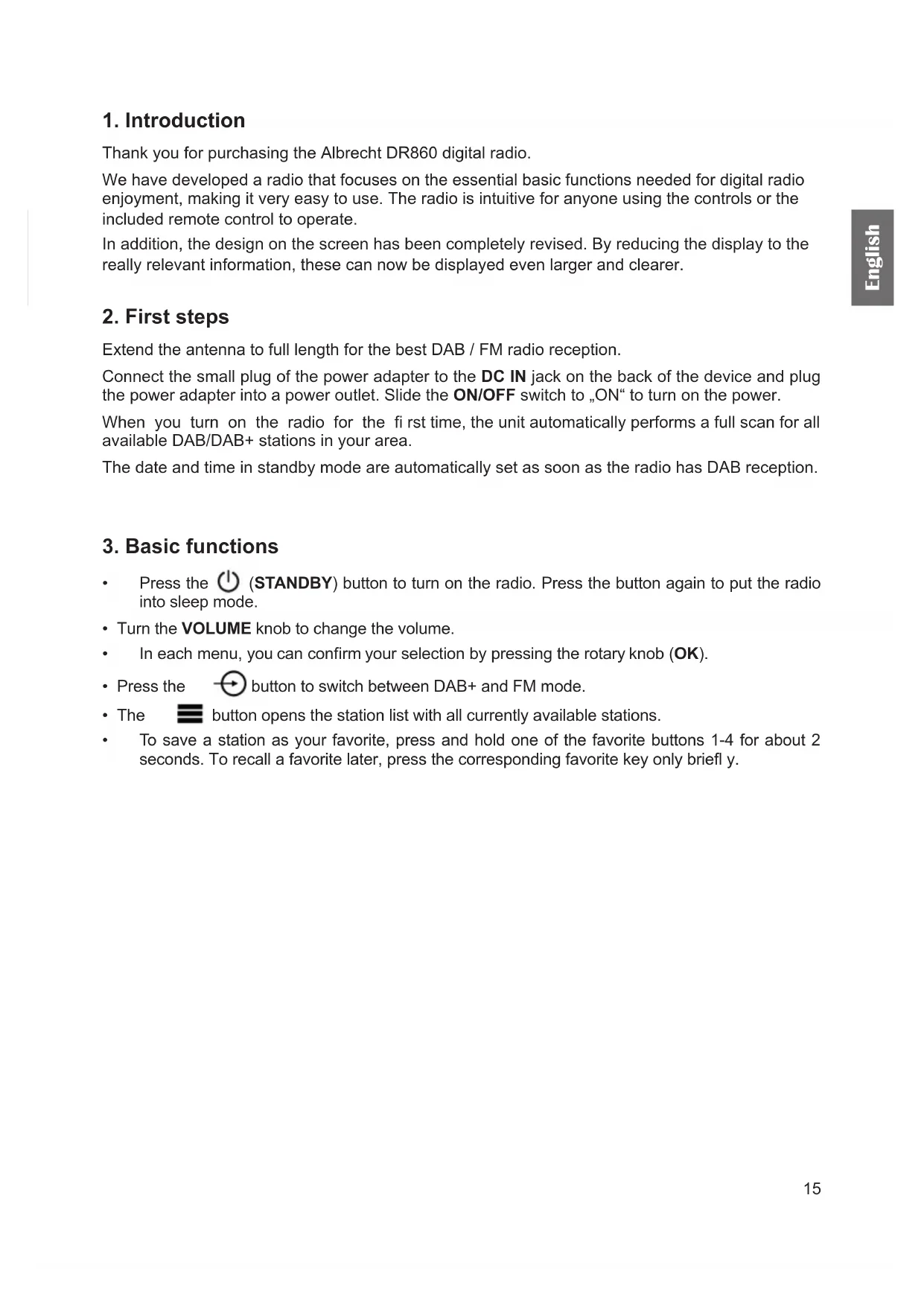 Thank you for purchasing the Albrecht DR860 digital radio. We have developed a radio that focuses on the essential basic functions needed for digital radio enjoyment, making it very easy to use. The radio is intuitive for anyone using the controls or the included remote control to operate. In addition, the design on the screen has been completely revised. By reducing the display to the really relevant information, these can now be displayed even larger and clearer.