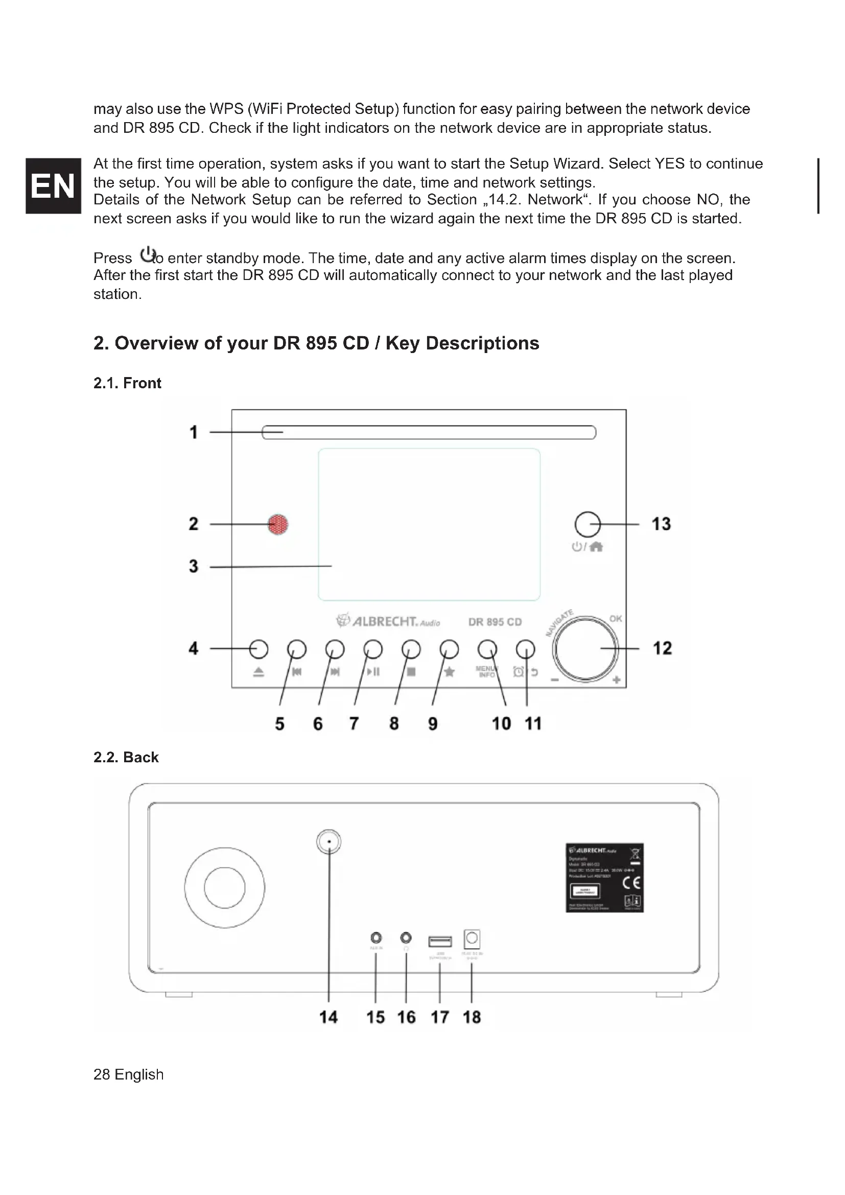 may also use the WPS (WiFi Protected Setup) function for easy pairing between the network device and DR 895 CD. Check if the light indicators on the network device are in appropriate status. At the rst time operation, system asks if you want to start the Setup Wizard. Select YES to continue the setup. You will be able to congure the date, time and network settings. Details of the Network Setup can be referred to Section „14.2. Network“. If you choose NO, the next screen asks if you would like to run the wizard again the next time the DR 895 CD is started. Press to enter standby mode. The time, date and any active alarm times display on the screen. After the rst start the DR 895 CD will automatically connect to your network and the last played station.