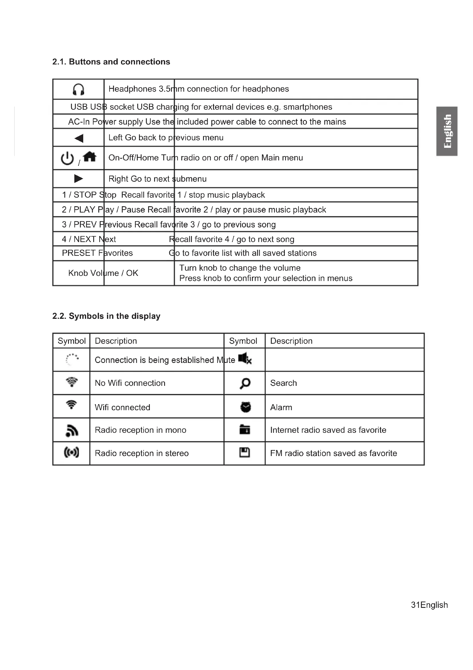 Right Go to next submenu 1 / STOP Stop Recall favorite 1 / stop music playback 2 / PLAY Play / Pause Recall favorite 2 / play or pause music playback 3 / PREV Previous Recall favorite 3 / go to previous song 4 / NEXT Next Recall favorite 4 / go to next song PRESET Favorites Go to favorite list with all saved stations Knob Volume / OK Turn knob to change the volume Press knob to con rm your selection in menus 2.2. Symbols in the display Symbol Description Symbol Description Connection is being established Mute No Wi connection Search Wi connected Alarm Radio reception in mono Internet radio saved as favorite Radio reception in stereo FM radio station saved as favorite32 English English