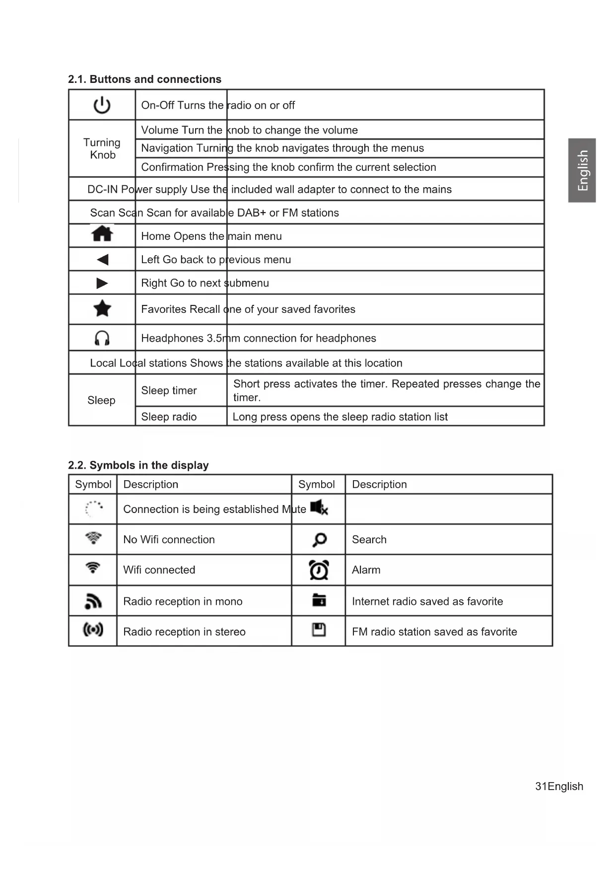 Right Go to next submenu Favorites Recall one of your saved favorites Headphones 3.5mm connection for headphones Local Local stations Shows the stations available at this location Sleep Sleep timer Short press activates the timer. Repeated presses change the timer. Sleep radio Long press opens the sleep radio station list 2.2. Symbols in the display Symbol Description Symbol Description Connection is being established Mute No Wi connection Search Wi connected Alarm Radio reception in mono Internet radio saved as favorite Radio reception in stereo FM radio station saved as favorite32 English English