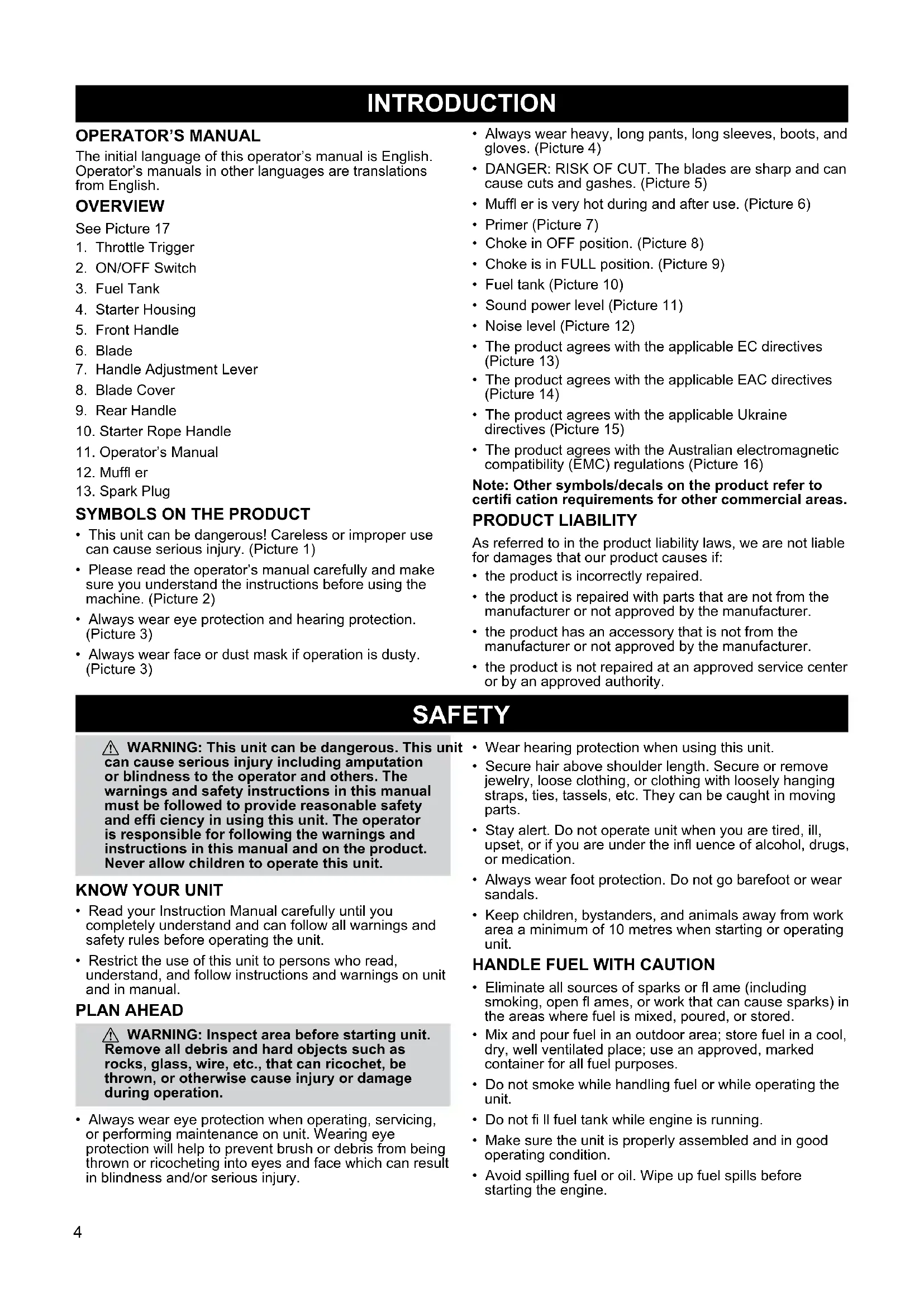 - Store in a dry area out of reach of children. SAFETY NOTICE: Exposure to vibrations through prolonged use of petrol powered hand tools could cause blood vessel or nerve damage in the fi ngers, hands, and joints of people prone to circulation disorders or abnormal swelling. Prolonged use in cold weather has been linked to blood vessel damage in otherwise healthy people. If symptoms occur such as numbness, pain, loss of strength, change in skin color or texture, or loss of feeling in the fi ngers, hands, or joints, discontinue the use of this tool and seek medical attention. An anti vibration system does not guarantee the avoidance of these problems. Users who operate power tools on a continual and regular basis must monitor closely their physical condition and the condition of this tool. ASSEMBLY a WARNING: If received assembled, repeat all steps to ensure your unit is properly assembled and all fasteners are secure. Follow all safety information in the manual and on the unit.