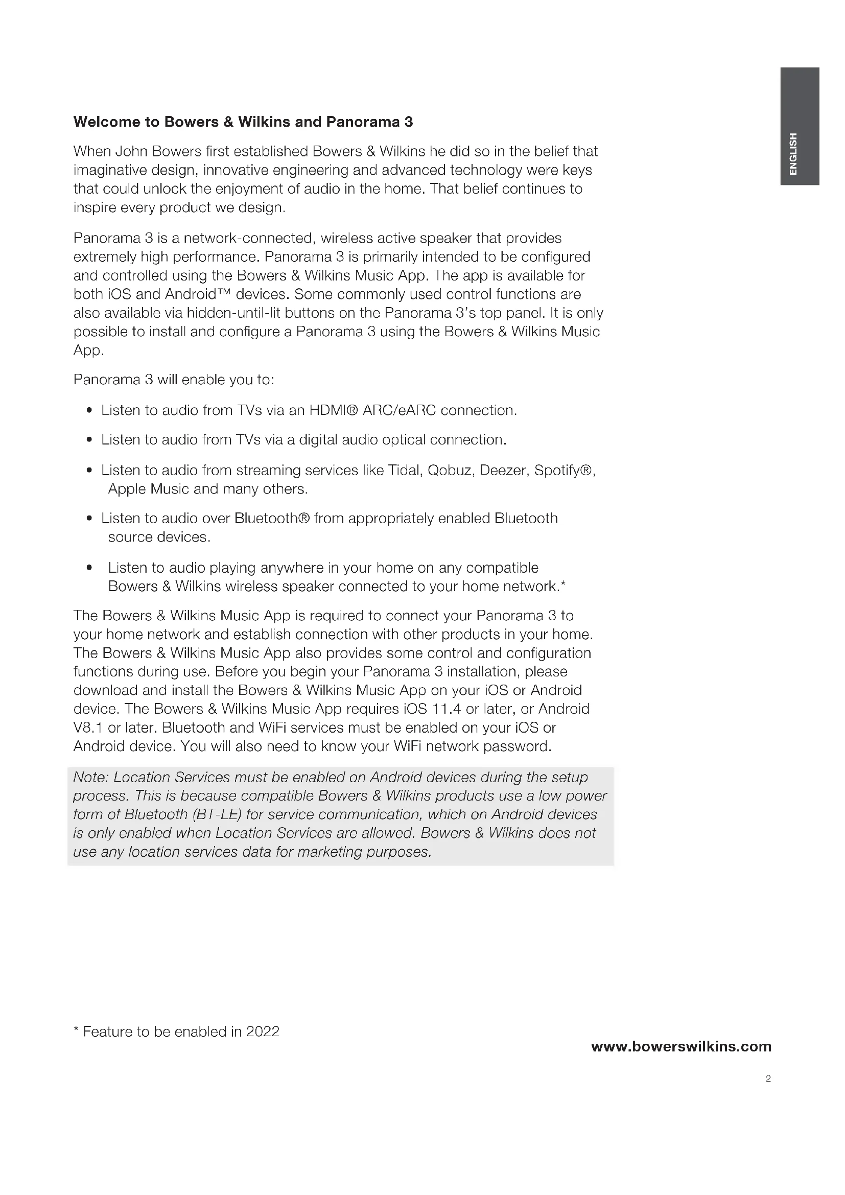 - Listen to audio playing anywhere in your home on any compatible Bowers & Wilkins wireless speaker connected to your home network.* The Bowers & Wilkins Music App is required to connect your Panorama 3 to your home network and establish connection with other products in your home. The Bowers & Wilkins Music App also provides some control and conguration functions during use. Before you begin your Panorama 3 installation, please download and install the Bowers & Wilkins Music App on your iOS or Android device. The Bowers & Wilkins Music App requires iOS 11.4 or later, or Android V8.1 or later. Bluetooth and WiFi services must be enabled on your iOS or Android device. You will also need to know your WiFi network password. Note: Location Services must be enabled on Android devices during the setup process. This is because compatible Bowers & Wilkins products use a low power form of Bluetooth (BT-LE) for service communication, which on Android devices is only enabled when Location Services are allowed. Bowers & Wilkins does not use any location services data for marketing purposes.