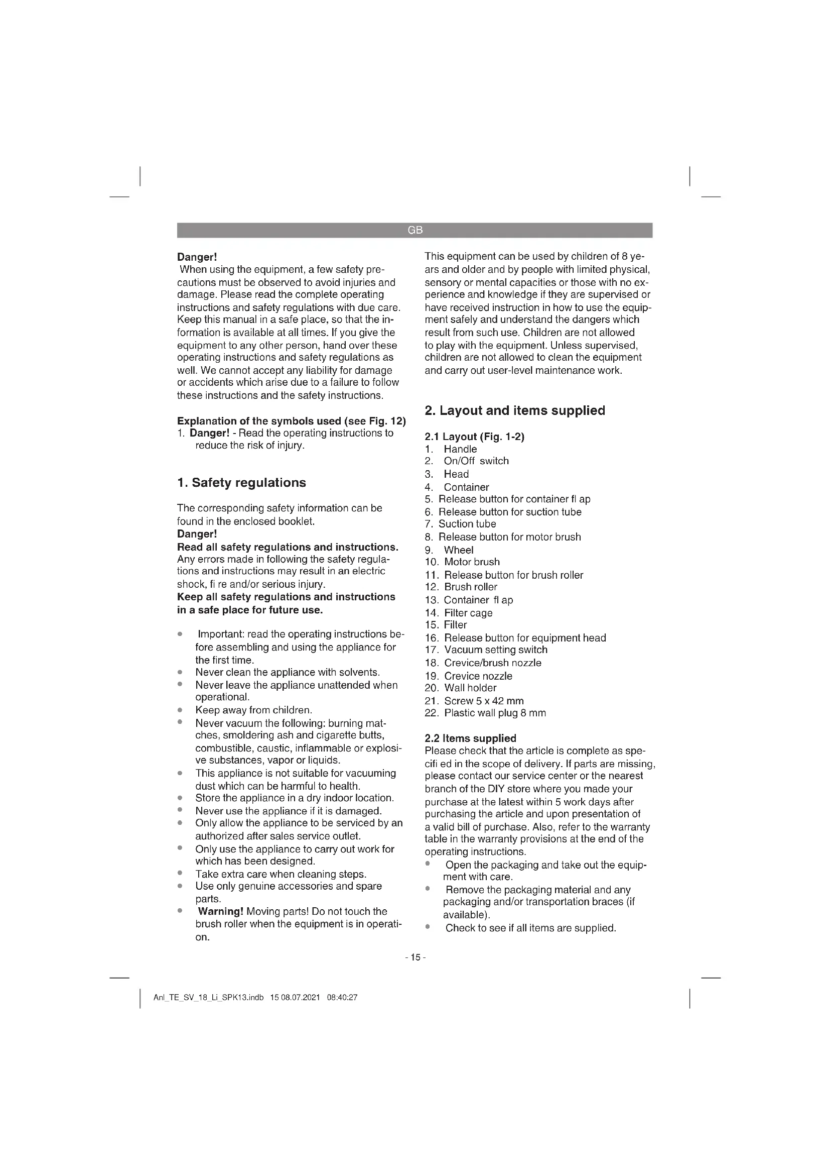 Warning! Moving parts! Do not touch the brush roller when the equipment is in operati- on. This equipment can be used by children of 8 ye- ars and older and by people with limited physical, sensory or mental capacities or those with no ex- perience and knowledge if they are supervised or have received instruction in how to use the equip- ment safely and understand the dangers which result from such use. Children are not allowed to play with the equipment. Unless supervised, children are not allowed to clean the equipment and carry out user-level maintenance work.
