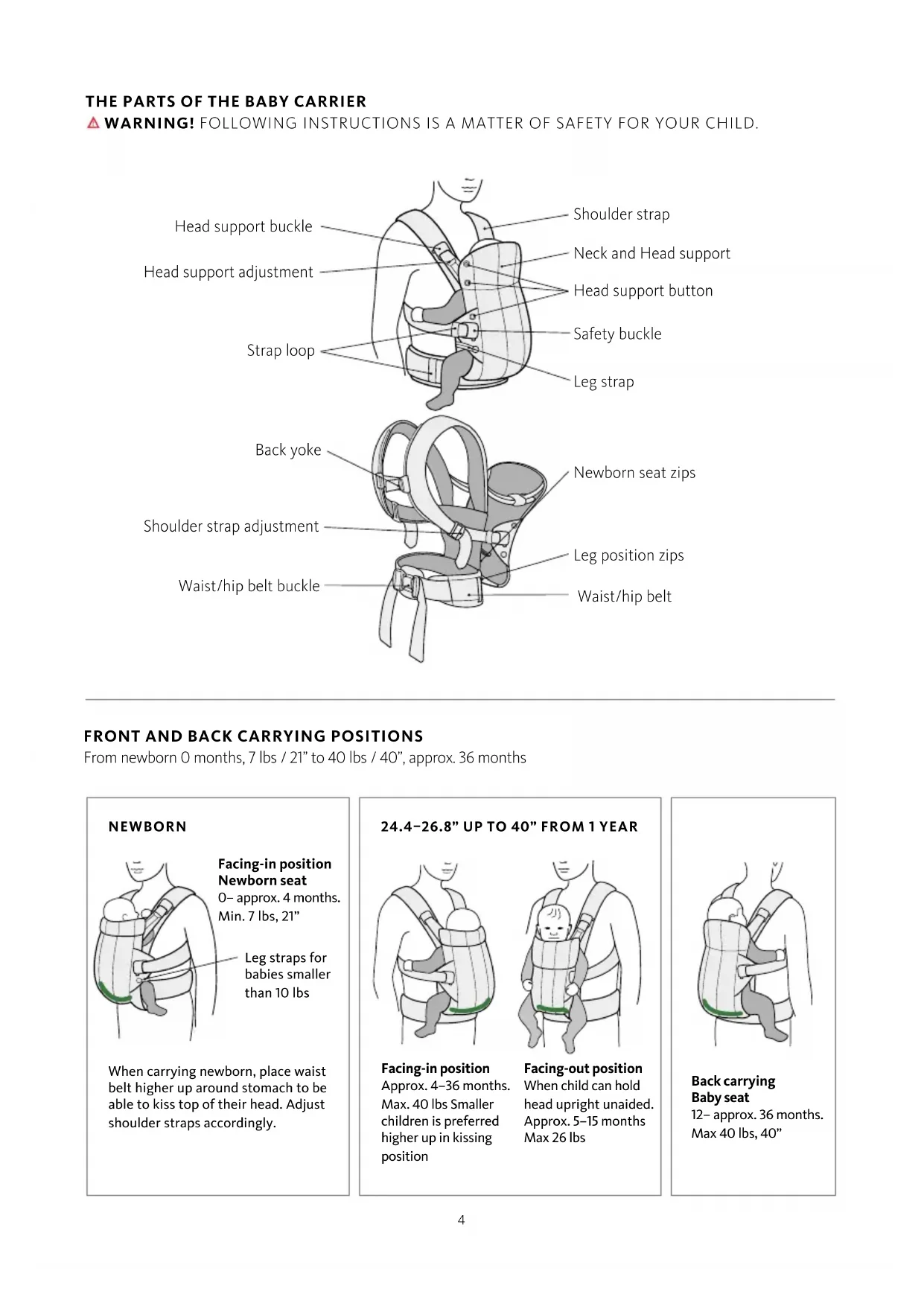 Back carrying Baby seat 12– approx. 36 months. Max 40 lbs, 40” Head support buckle Strap loop Shoulder strap Neck and Head support Head support button Safety buckle Leg strap Back yoke Waist/hip belt buckle Shoulder strap adjustment Leg position zips Waist/hip belt Newborn seat zips Head support adjustment NEWBORN When carrying newborn, place waist belt higher up around stomach to be able to kiss top of their head. Adjust shoulder straps accordingly. Facing-in position Newborn seat 0– approx. 4 months. Min. 7 lbs, 21” Leg straps for babies smaller than 10 lbs
