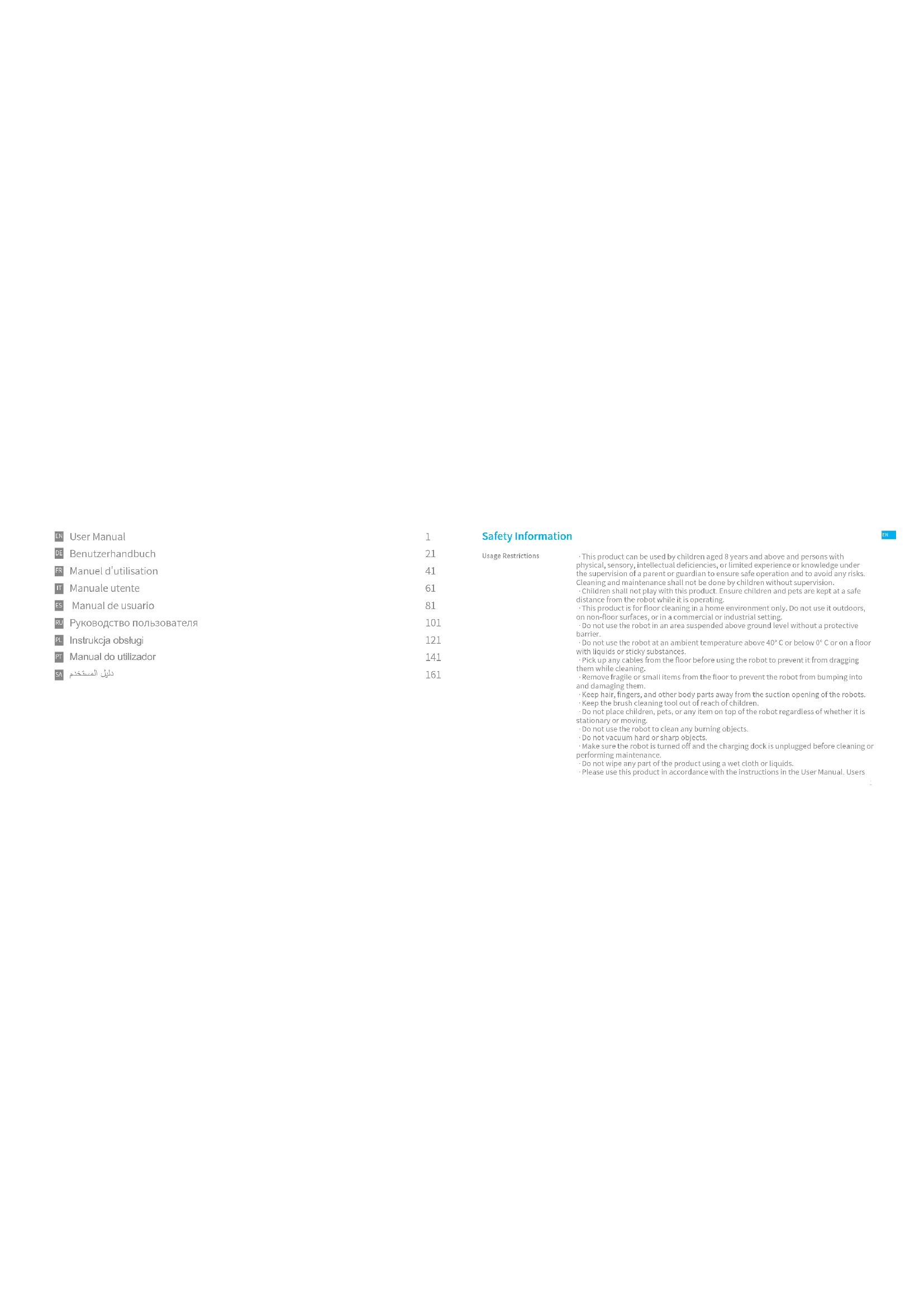 Clean the Main Brush Clean the Side Brush Clean the Main Wheel/Omnidirectional Wheel Routine Maintenance Press the brush guard clips inwards to remove the brush guard and lift the brush out of the robot. Pull out the side brush and use the included cleaning tool to remove any hair tangled on the brush. Pull out the brush cover as shown in the diagram. Use the included cleaning tool to remove any hairs tangled in the brush. Note: Do not pull out the hair excessively to avoid damaging the main brush when the hair is tightly tangled in the main brush. Note: Use a tool such as a small screwdriver to separate the axle and the tire. Clean the Laser Distance Sensor/Returning-to-dock Sensor/Edge Sensor Clean the Charging Contact Clean the Cli Sensor Routine Maintenance Note: Wet cloths can damage sensitive elements within the robot and charging dock. Please use dry rags for cleaning. Robot Restarting If the robot stops responding or cannot be turned o, press and hold down the button for 10 seconds to forcefully turn it o. Then press and hold the button for 3 seconds to turn the robot on. Battery The robot contains a high-performance lithium-ion battery pack. Please ensure that it remains well-charged for daily use to maintain optimal battery performance. If the robot is not used for an extended period of time, turn it o and put it away. To prevent damage from over-discharging, the robot should be recharged at least once every three months.18 19