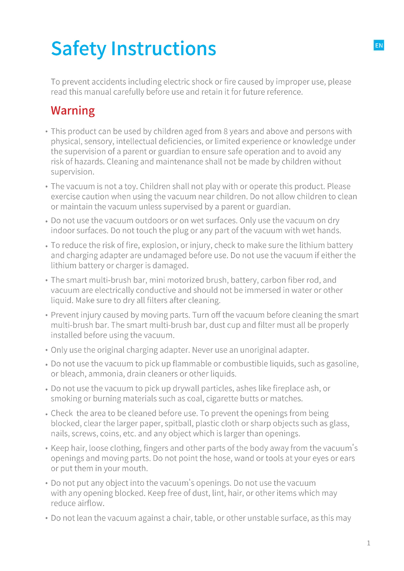 The smart multi-brush bar, mini motorized brush, battery, carbon ber rod, and vacuum are electrically conductive and should not be immersed in water or other liquid. Make sure to dry all lters after cleaning.