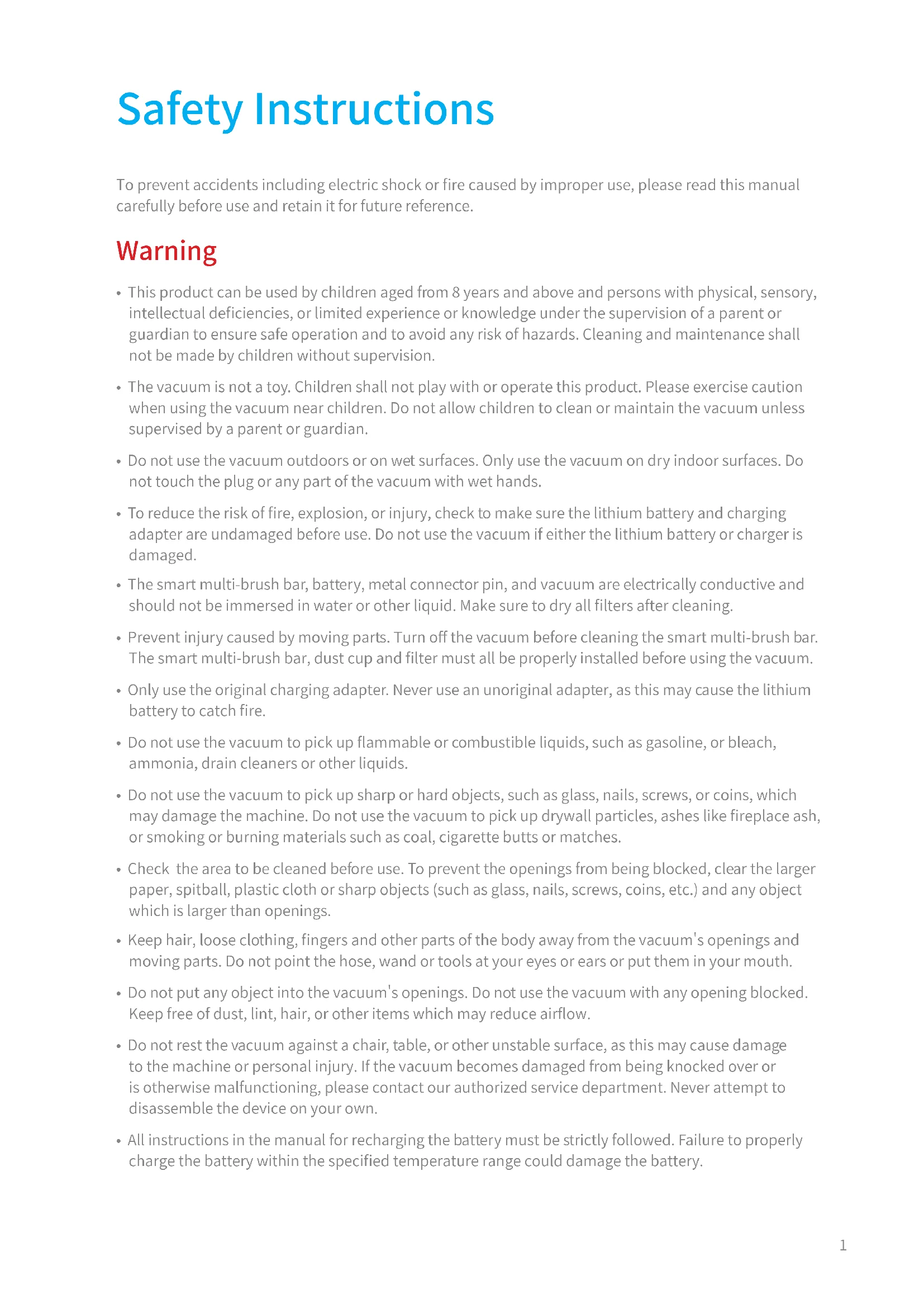 - The smart multi-brush bar, battery, metal connector pin, and vacuum are electrically conductive and should not be immersed in water or other liquid. Make sure to dry all lters after cleaning.