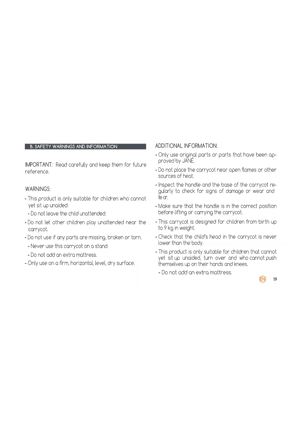 IMPORTANT: Read carefully and keep them for future reference. WARNINGS: - This product is only suitable for children who cannot yet sit up unaided. - Do not leave the child unattended. - Do not let other children play unattended near the carrycot. - Do not use if any parts are missing, broken or torn. - Never use this carrycot on a stand. - Do not add an extra mattress. - Only use on a rm, horizontal, level, dry surface. ADDITIONAL INFORMATION: - Only use original parts or parts that have been ap- proved by JANÉ. - Do not place the carrycot near open ames or other sources of heat. - Inspect the handle and the base of the carrycot re- gularly to check for signs of damage or wear and te ar. - Make sure that the handle is in the correct position before lifting or carrying the carrycot. - This carrycot is designed for children from birth up to 9 kg in weight. - Check that the child’s head in the carrycot is never lower than the body. - This product is only suitable for children that cannot yet sit up unaided, turn over and who cannot push themselves up on their hands and knees. - Do not add an extra mattress.EN