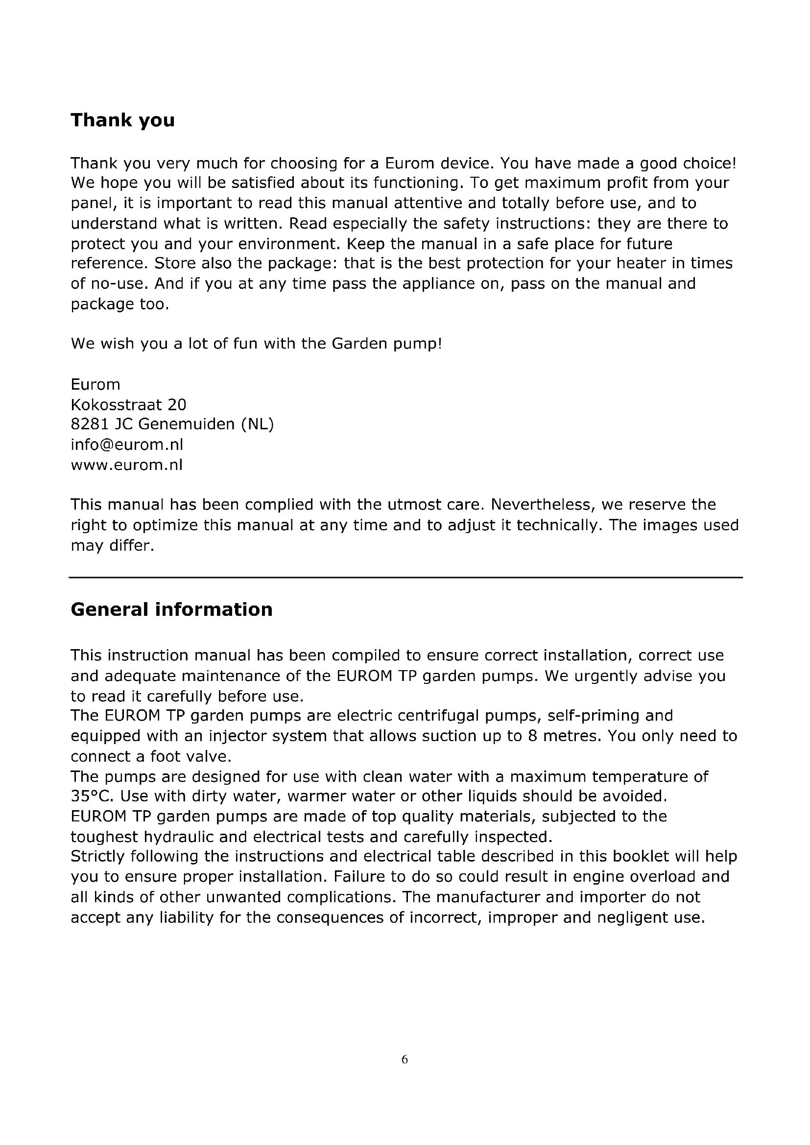 General information This instruction manual has been compiled to ensure correct installation, correct use and adequate maintenance of the EUROM TP garden pumps. We urgently advise you to read it carefully before use. The EUROM TP garden pumps are electric centrifugal pumps, self-priming and equipped with an injector system that allows suction up to 8 metres. You only need to connect a foot valve. The pumps are designed for use with clean water with a maximum temperature of 35°C. Use with dirty water, warmer water or other liquids should be avoided. EUROM TP garden pumps are made of top quality materials, subjected to the toughest hydraulic and electrical tests and carefully inspected. Strictly following the instructions and electrical table described in this booklet will help you to ensure proper installation. Failure to do so could result in engine overload and all kinds of other unwanted complications. The manufacturer and importer do not accept any liability for the consequences of incorrect, improper and negligent use.7 Technical specifications Type TP800P TP800R TP1200R Power 800W 800W 1200W Capacity max. 53 l/m 53 l/m 63 l/m Discharge head max. 40m 40m 48m Suction height max.