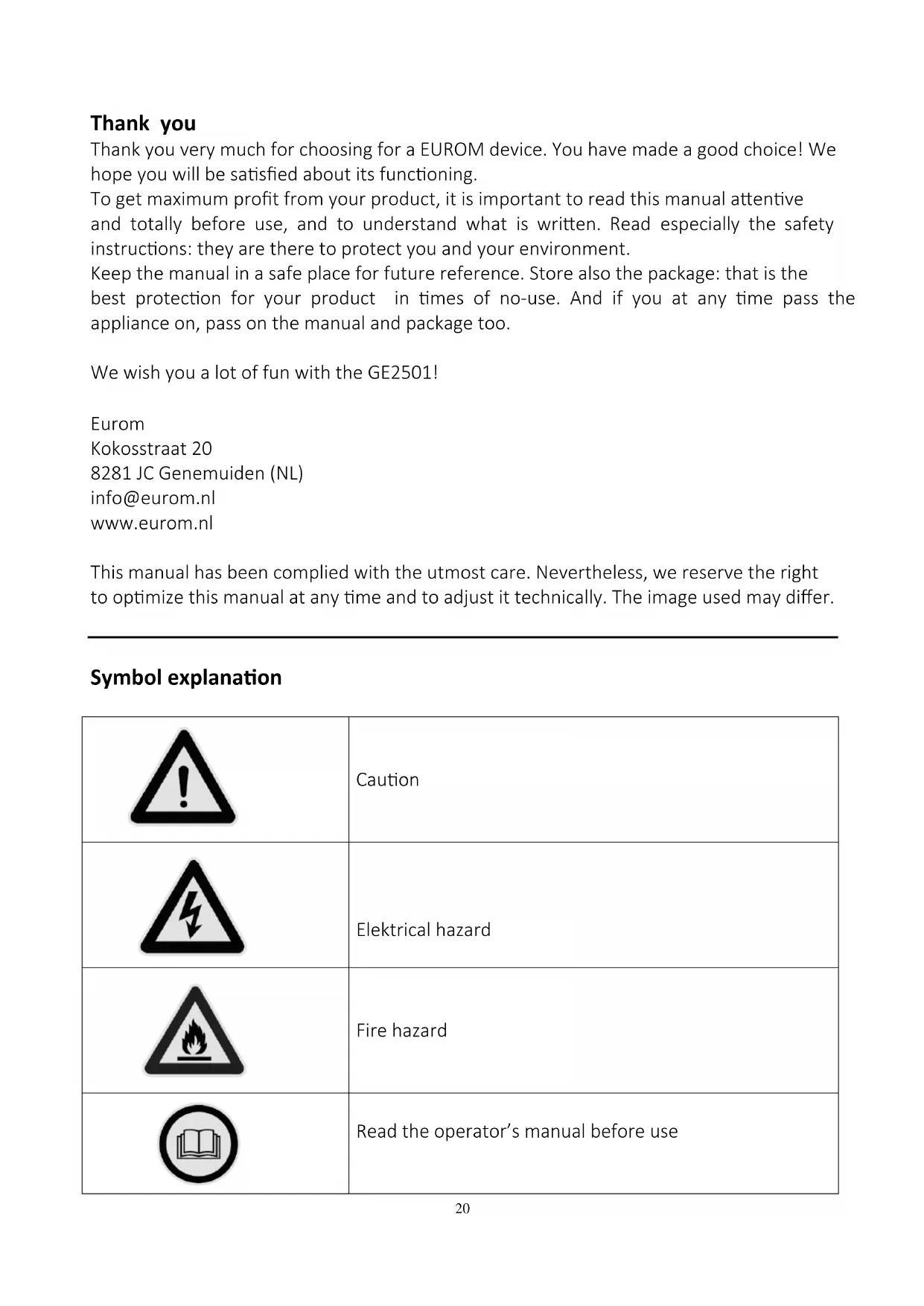 Entsorgen Sie das Gerät am Ende seiner Lebensdauer gemäß den örtlichen Gesetzen und Vorschriften oder liefern Sie es an Ihren Lieferanten. Anhänge Eine Übersicht mit Verwendungen und die EU-Konformitätserklärung finden Sie am Ende dieses Handbuchs.20 Thank you Thank you very much for choosing for a EUROM device. You have made a good choice! We hope you will be satisfied about its functioning. To get maximum profit from your product, it is important to read this manual attentive and totally before use, and to understand what is written. Read especially the safety instructions: they are there to protect you and your environment. Keep the manual in a safe place for future reference. Store also the package: that is the best protection for your product in times of no-use. And if you at any time pass the appliance on, pass on the manual and package too. We wish you a lot of fun with the GE2501! Eurom Kokosstraat 20 8281 JC Genemuiden (NL) info@eurom.nl www.eurom.nl This manual has been complied with the utmost care. Nevertheless, we reserve the right to optimize this manual at any time and to adjust it technically. The image used may differ.
