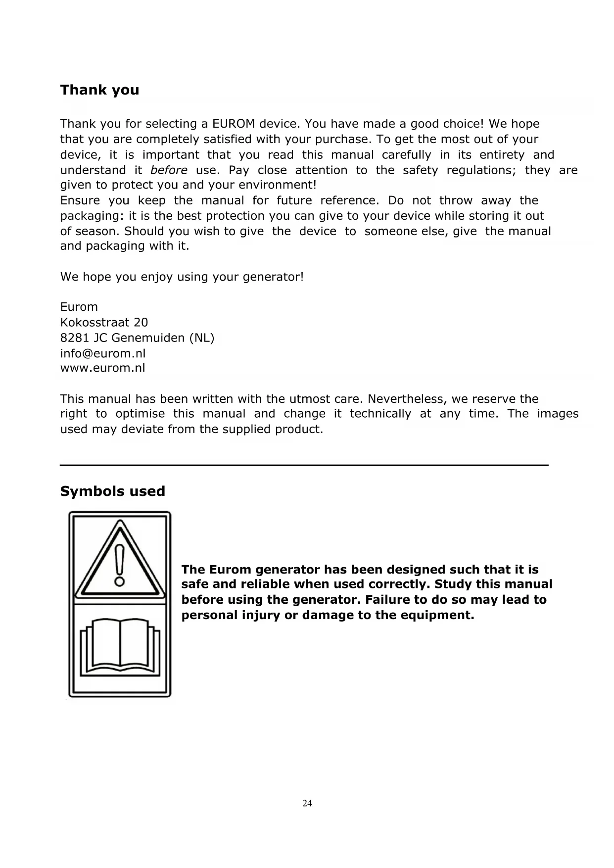 The Eurom generator has been designed such that it is safe and reliable when used correctly. Study this manual before using the generator. Failure to do so may lead to personal injury or damage to the equipment.25