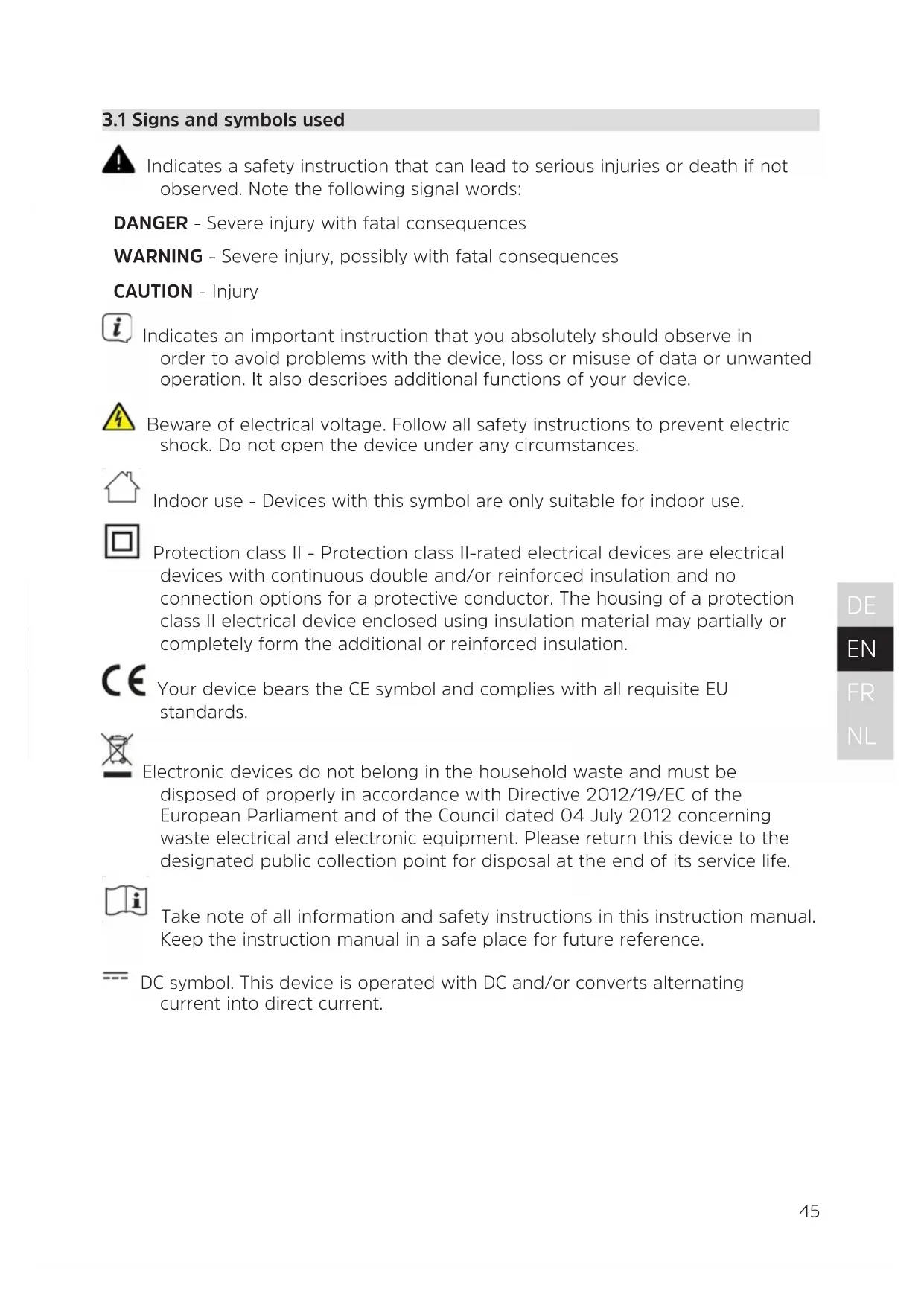 Indicates a safety instruction that can lead to serious injuries or death if not observed. Note the following signal words: DANGER - Severe injury with fatal consequences WARNING - Severe injury, possibly with fatal consequences CAUTION - Injury Indicates an important instruction that you absolutely should observe in order to avoid problems with the device, loss or misuse of data or unwanted operation. It also describes additional functions of your device. Beware of electrical voltage. Follow all safety instructions to prevent electric shock. Do not open the device under any circumstances. Indoor use - Devices with this symbol are only suitable for indoor use. Protection class II - Protection class II-rated electrical devices are electrical devices with continuous double and/or reinforced insulation and no connection options for a protective conductor. The housing of a protection class II electrical device enclosed using insulation material may partially or completely form the additional or reinforced insulation. Your device bears the CE symbol and complies with all requisite EU standards. Electronic devices do not belong in the household waste and must be disposed of properly in accordance with Directive 2012/19/EC of the European Parliament and of the Council dated 04 July 2012 concerning waste electrical and electronic equipment. Please return this device to the designated public collection point for disposal at the end of its service life. Take note of all information and safety instructions in this instruction manual. Keep the instruction manual in a safe place for future reference. DC symbol. This device is operated with DC and/or converts alternating current into direct current.46
