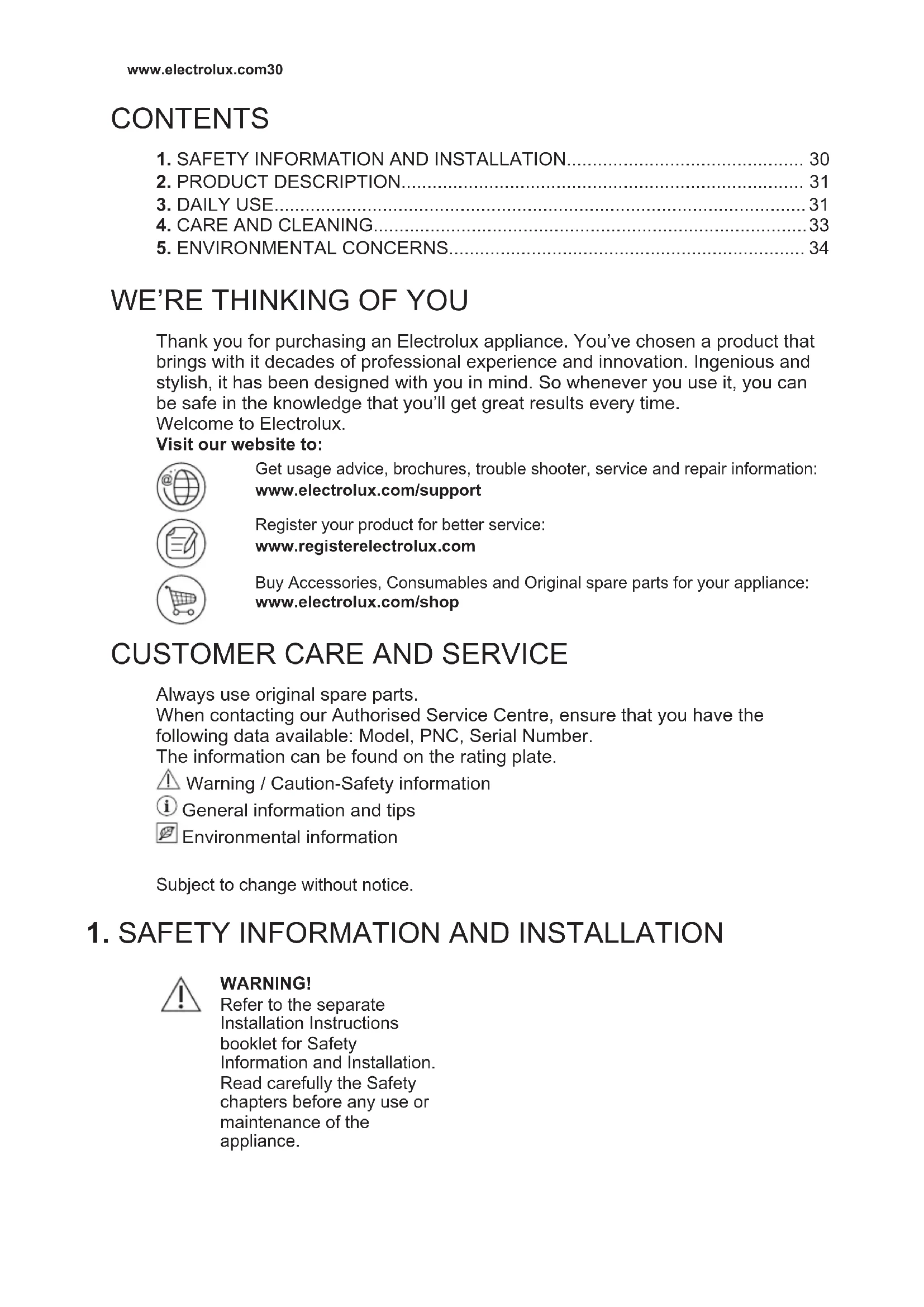 WARNING! Refer to the separate Installation Instructions booklet for Safety Information and Installation. Read carefully the Safety chapters before any use or maintenance of the appliance. www.electrolux.com302. PRODUCT DESCRIPTION