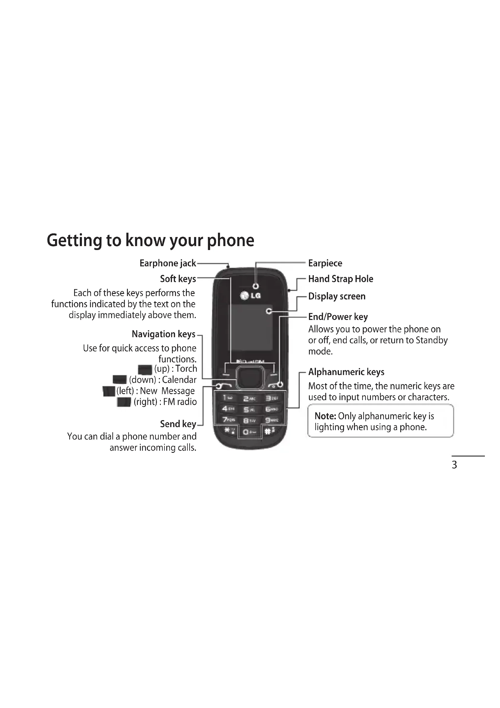 Display Information Icon areas Text and graphic area Soft key indications Menu Contacts On-Screen Icons Tells you the strength of the network signal. Indicates the battery charge level. Indicates new text message(s). Indicates new voice message(s). Indicates that the alarm clock is set. Indicates that your phone is using the general prole. Indicates that your phone is using the silent prole. Indicates that your phone is using the outdoor prole. Indicates that your phone is using the headset prole. Indicates that all calls are being diverted to another number. Indicates that your phone is in Flight mode. Indicates new schedule(s).8 Your phone oers a set of functions that allow you to customise it. These functions are arranged in menus and sub-menus, which are accessed via the left and right soft keys. The label at the bottom of the display screen immediately above the soft keys indicates their current function. Press the right soft key to access contacts. Press the left soft key to access the available menu. Menu Contacts Menu and Options9 Entering Text You can enter alphanumeric characters via the phone’s keypad. For example, storing names in Contacts, writing a message and scheduling events in the calendar all require entering text. To change modes, press the key. Indicator Function (English Smart mode) Numeric Multitap Abc Multitap abc Multitap ABC T9 Mode In Editor, Press Options Choose “Set T9” Select On. This mode allows you to enter words with only one keystroke per letter. Each key on the keypad is associated with more than one letter. T9 mode automatically compares your keystrokes with an internal linguistic dictionary to determine the correct word, thus requiring far fewer keystrokes than the traditional ABC mode. Turning Your Phone On and O You can power the phone on and o by pressing or holding the power key.10 Entering Text Making a Call 1 Key in the number on the keypad. 2 Press to initiate the call. 3 To end the call, press . TIP! To enter + when making an international call, press and hold 0. Making a call from your contacts 1 Press Menu, select Contacts and choose Search. 2 On the keypad, enter the rst few letter of the contact you want to call. 3 To scroll through your contacts, use the up and down navigation keys. And to scroll through their dierent numbers, use the left and right navigation keys. 4 Press to initiate the call. Answering and rejecting a call When your phone rings, press Accept or press to answer the call. While your phone is ringing, select Silent to mute the ringing. This is great if you have forgotten to change your prole to Silent for a meeting. Press or Reject to reject the incoming call.11 TIP! You can change the settings on your phone to answer your calls in dierent ways. Press Menu, select Settings and choose Call. Press Common settings, select Answer mode and choose Any key or Send key only.