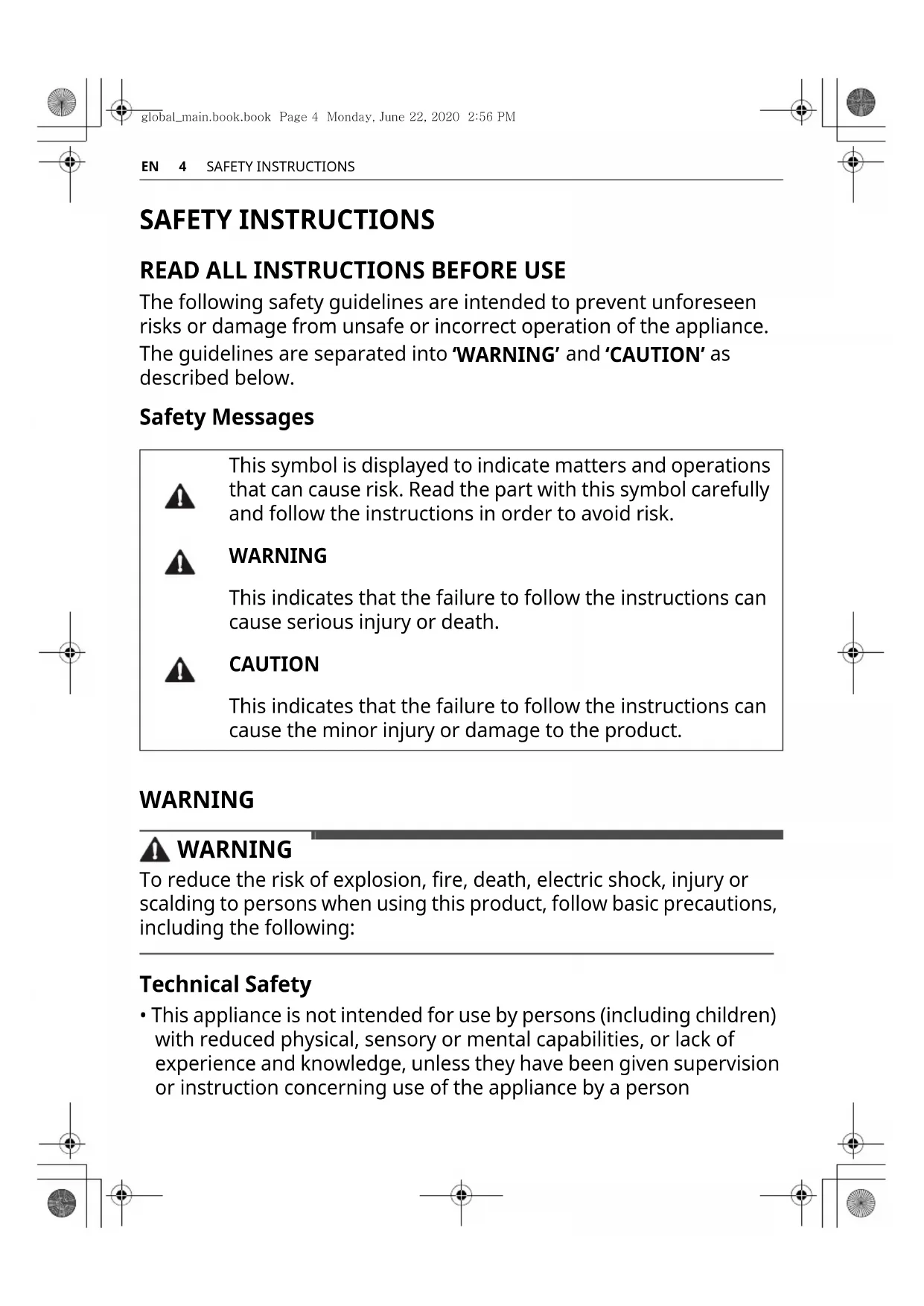 - This appliance is not intended for use by persons (including children) with reduced physical, sensory or mental capabilities, or lack of experience and knowledge, unless they have been given supervision or instruction concerning use of the appliance by a person This symbol is displayed to indicate matters and operations that can cause risk. Read the part with this symbol carefully and follow the instructions in order to avoid risk. WARNING This indicates that the failure to follow the instructions can cause serious injury or death. CAUTION This indicates that the failure to follow the instructions can cause the minor injury or damage to the product. global_main.book.book Page 4 Monday, June 22, 2020 2:56 PM5 SAFETY INSTRUCTIONS