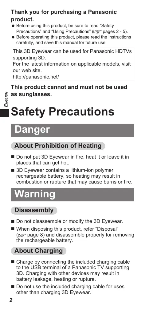ENGLISH This 3D Eyewear can be used for Panasonic HDTVs supporting 3D.
