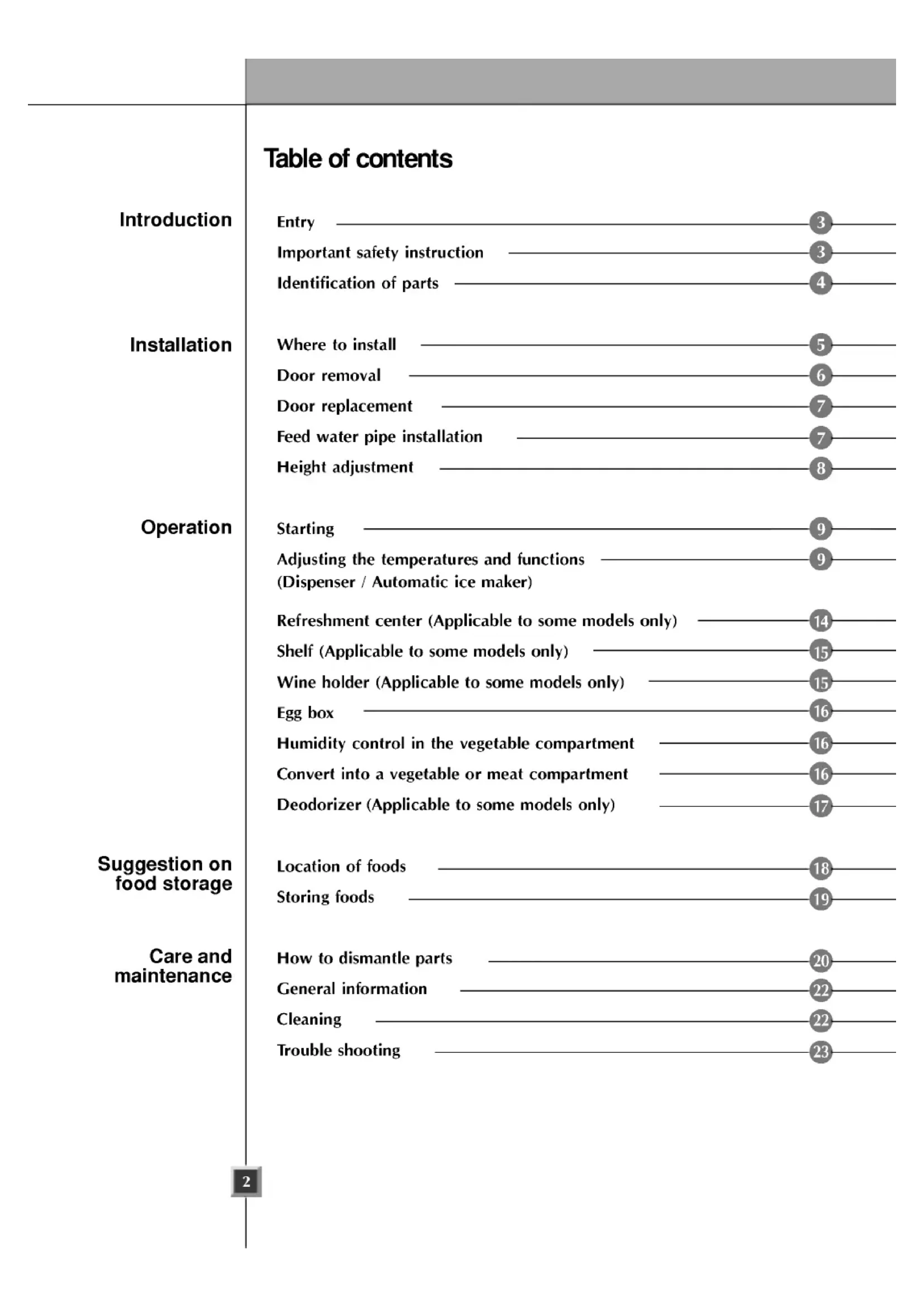 parts Where install Door removal Door replacement Feed water pipe installation Height adjustment Starting Adjusting the temperatures and functions (Dispenser Automatic ice maker) Refreshment center (Applicable tosome models only) Shelf (Applicable tosome models only) Wine holder (Applicable tosome models only) Egg box Humidity control the vegetable compartment Convert into vegetable ormeat compartment Deodorizer (Applicable tosome models only) Location