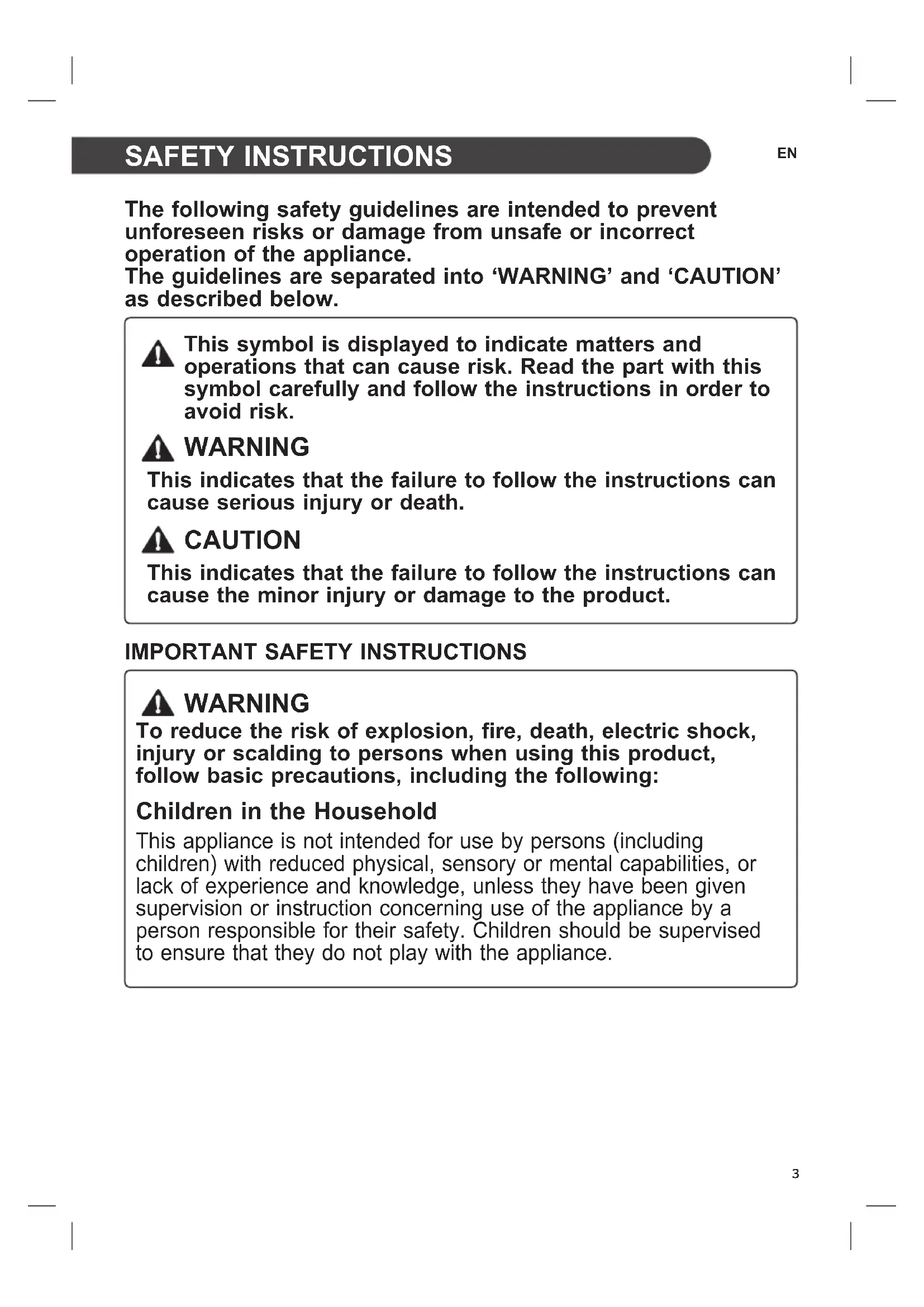 WARNING To reduce the risk of explosion, fire, death, electric shock, injury or scalding to persons when using this product, follow basic precautions, including the following: Children in the Household This appliance is not intended for use by persons (including children) with reduced physical, sensory or mental capabilities, or lack of experience and knowledge, unless they have been given supervision or instruction concerning use of the appliance by a person responsible for their safety. Children should be supervised to ensure that they do not play with the appliance.4