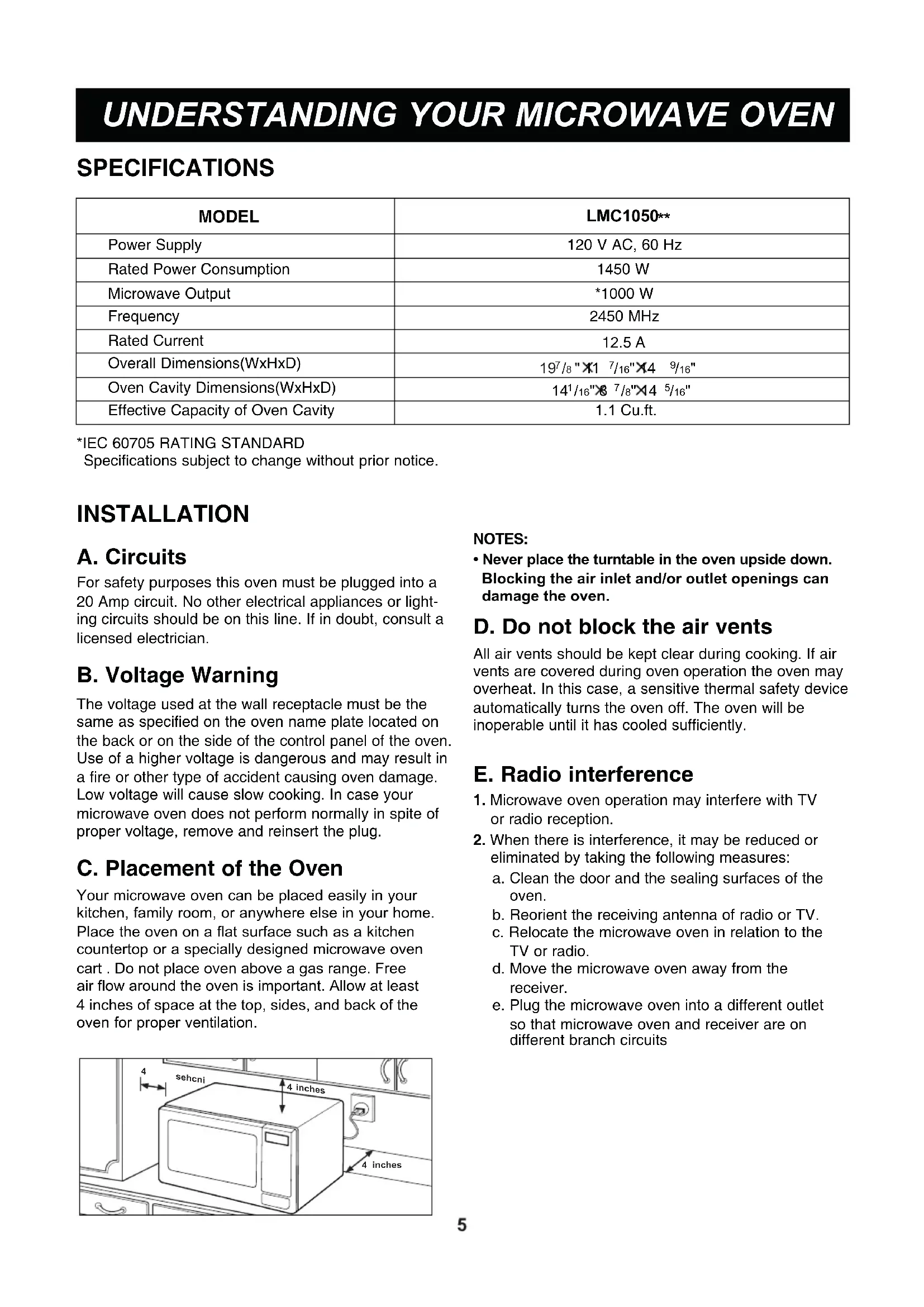 INSTALLATION A. Circuits For safety purposes this oven must be plugged into a 20 Amp circuit. No other electrical appliances or light- ing circuits should be on this line. If in doubt, consult a licensed electrician. B. Voltage Warning The voltage used at the wall receptacle must be the same as specified on the oven name plate located on the back or on the side of the control panel of the oven. Use of a higher voltage is dangerous and may result in a fire or other type of accident causing oven damage. Low voltage will cause slow cooking. In case your microwave oven does not perform normally in spite of proper voltage, remove and reinsert the plug. C. Placement of the Oven Your microwave oven can be placed easily in your kitchen, family room, or anywhere else in your home. Place the oven on a flat surface such as a kitchen countertop or a specially designed microwave oven cart . Do not place oven above a gas range. Free air flow around the oven is important. Allow at least 4 inches of space at the top, sides, and back of the oven for proper ventilation. NOTES: