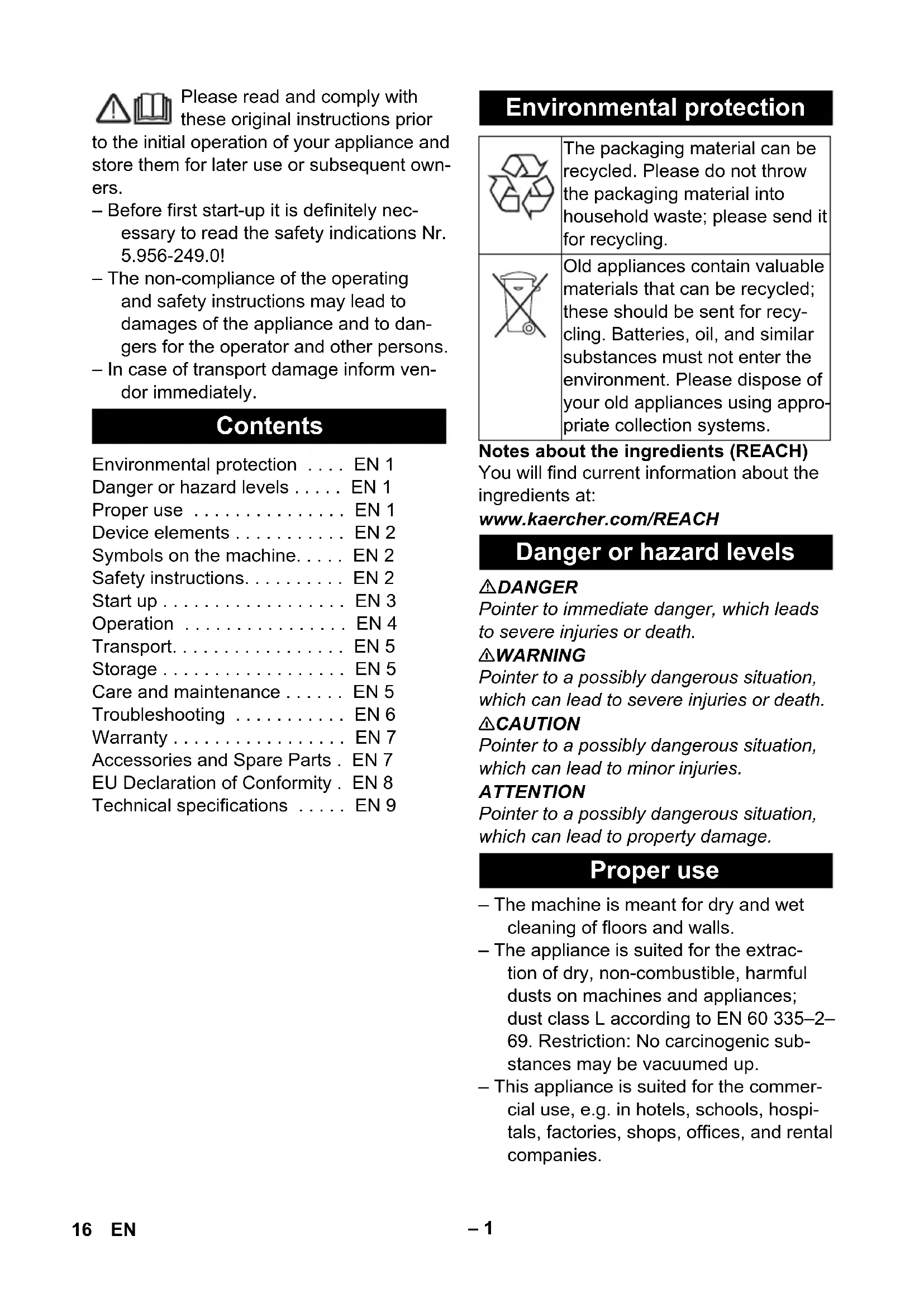 stances may be vacuumed up. – This appliance is suited for the commer- cial use, e.g. in hotels, schools, hospi- tals, factories, shops, offices, and rental companies. Contents Environmental protection ... EN 1 Danger or hazard levels ... EN 1 Proper use ... EN 1 Device elements ... EN 2 Symbols on the machine... EN 2 Safety instructions... EN 2 Start up ... EN 3 Operation ... EN 4 Transport... EN 5 Storage ... EN 5 Care and maintenance ... EN 5 Troubleshooting ... EN 6 Warranty ... EN 7 Accessories and Spare Parts . EN 7 EU Declaration of Conformity . EN 8 Technical specifications ... EN 9 Environmental protection The packaging material can be recycled. Please do not throw the packaging material into household waste; please send it for recycling. Old appliances contain valuable materials that can be recycled; these should be sent for recy- cling. Batteries, oil, and similar substances must not enter the environment. Please dispose of your old appliances using appro- priate collection systems. Danger or hazard levels Proper use 16 EN– 2 1 Electrodes 2 Suction support 3 Suction hose 4 Hose hook 5 Push handle lock (NT 50/1 only) 6 Crevice nozzle 7 Air outlet, working air 8 Suction head 9 Suction head lock 10 Recessed grip 11 Dirt receptacle 12 Steering roller 13 Handle (NT 50/1 only) 14 Air inlet, motor cooling air 15 Floor nozzle 16 Suction tube 17 Stop for tool box 18 Rubber sleeve, screwable 19 Fixing eyelet 20 Filter cover 21 Carrying handle 22 Suction force regulator (continuous) 23 Tool adapter (Ap Te L only) 24 Push handle (NT 50/1 only) 25 Button for filter shake off system 26 Rotating knob 27 Socket (Ap Te L only) 28 Floor nozzle holder 29 Drain hose (NT 50/1 only) 30 Holder for suction pipe 31 Cable hook (NT 50/1 only) 32 Bender 33 Power cord 34 Bender holder (NT 30/1, NT 40/1 only) 35 Filter frame 36 Flat fold filter (PES) 37 Filter dedusting 38 Nameplate DANGER – When the outgoing air is carried back into the room, a sufficient ventilation rate L in the room must be ensured. To comply with the required limit values the carried back volume flow must be 50% of the fresh air volume flow (room vol- ume V