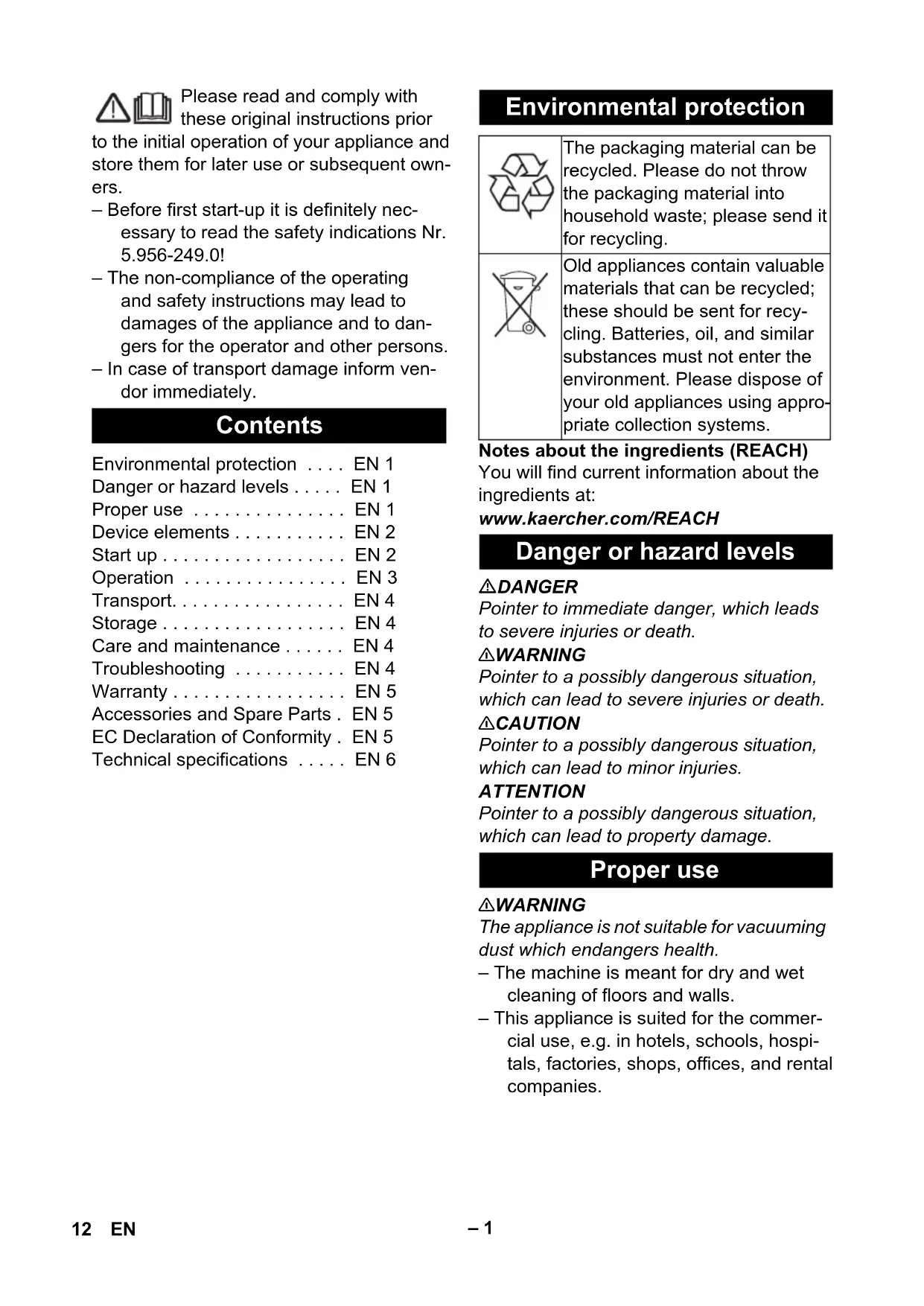 Replace the flat pleated filter. Clean the electrodes as well as the space between the electrodes with a brush. Continuously check the filling level in case of non-conductive liquid. Transport Storage Care and maintenance Exchanging the flat pleated filter Cleaning the electrodes Troubleshooting Suction turbine does not run Suction turbine turns off Suction turbine does not start again after the container has been emptied Suction capacity decreases Dust comes out while vacuuming Automatic shut-off (wet vacuum cleaning) does not react 15EN– 5 Suction hose is not connected. Inform Customer Service. Inform Customer Service. If malfunction can not be fixed, the de- vice must be checked by customer ser- vice. The warranty terms published by the rele- vant sales company are applicable in each country. We will repair potential failures of your appliance within the warranty period free of charge, provided that such failure is caused by faulty material or defects in man- ufacturing. In the event of a warranty claim please contact your dealer or the nearest authorized Customer Service centre. Please submit the proof of purchase. Only use original accessories and spare parts, they ensure the safe and trouble-free operation of the device. For information about accessories and spare parts, please visit www.kaercher.com. We hereby declare that the machine de- scribed below complies with the relevant basic safety and health requirements of the EU Directives, both in its basic design and construction as well as in the version put into circulation by us. This declaration shall cease to be valid if the machine is modified without our prior approval. 5.957-701 The undersigned act on behalf and under the power of attorney of the company man- agement. Authorised Documentation Representative S. Reiser Alfred Kärcher GmbH Co. KG Alfred-Kärcher-Str. 28 - 40 71364 Winnenden (Germany) Phone: +49 7195 14-0 Fax: +49 7195 14-2212 Winnenden, 2016/01/01 Automatic filter cleaning is not working Automatic filter cleaning cannot be switched off Automatic filter cleaning cannot be switched on Customer Service Warranty Accessories and Spare Parts EC Declaration of Conformity Product: Wet and dry vacuum cleaner Type: 1.667-xxx Relevant EU Directives 2006/42/EC (+2009/127/EC) 2014/30/EU 2011/65/EU Applied harmonized standards EN 55014–1: 2006+A1: 2009+A2: 2011 EN 55014–2: 1997+A1: 2001+A2: 2008 EN 60335–1 EN 60335–2–69 EN 61000–3–2: 2014 EN 61000–3–3: 2013 EN 62233: 2008 EN 50581 Applied national standards